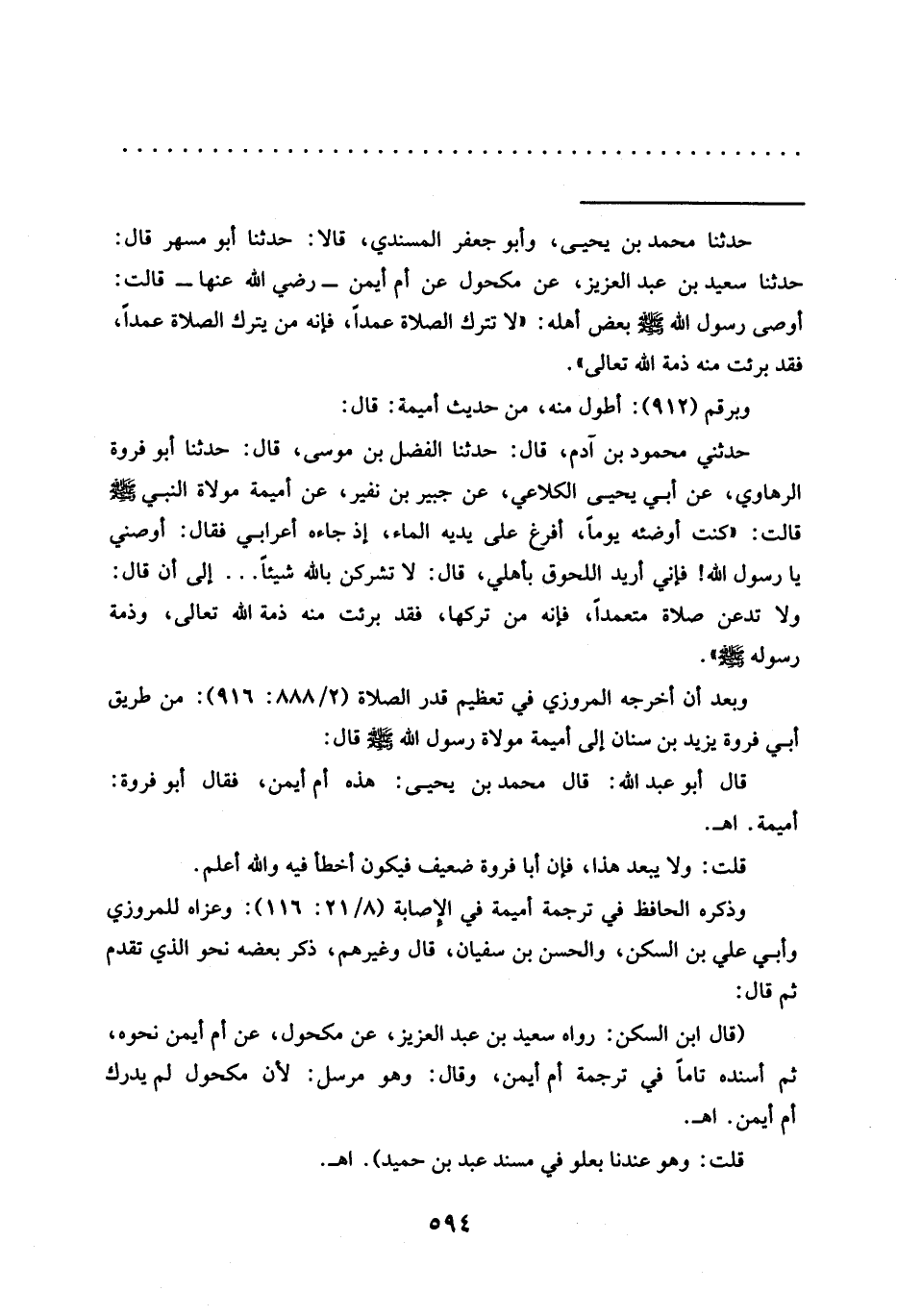 وبعد أن أخرجه المروزي في تعظيم قدر الصلاة (2/ 888: 916): من طريق أبي فروة يزيد بن سنان إلى أميمة مَوْلَاةِ رَسُولِ اللَّهِ -صَلَّى اللَّهُ عَلَيْهِ وَسَلَّمَ- قال: