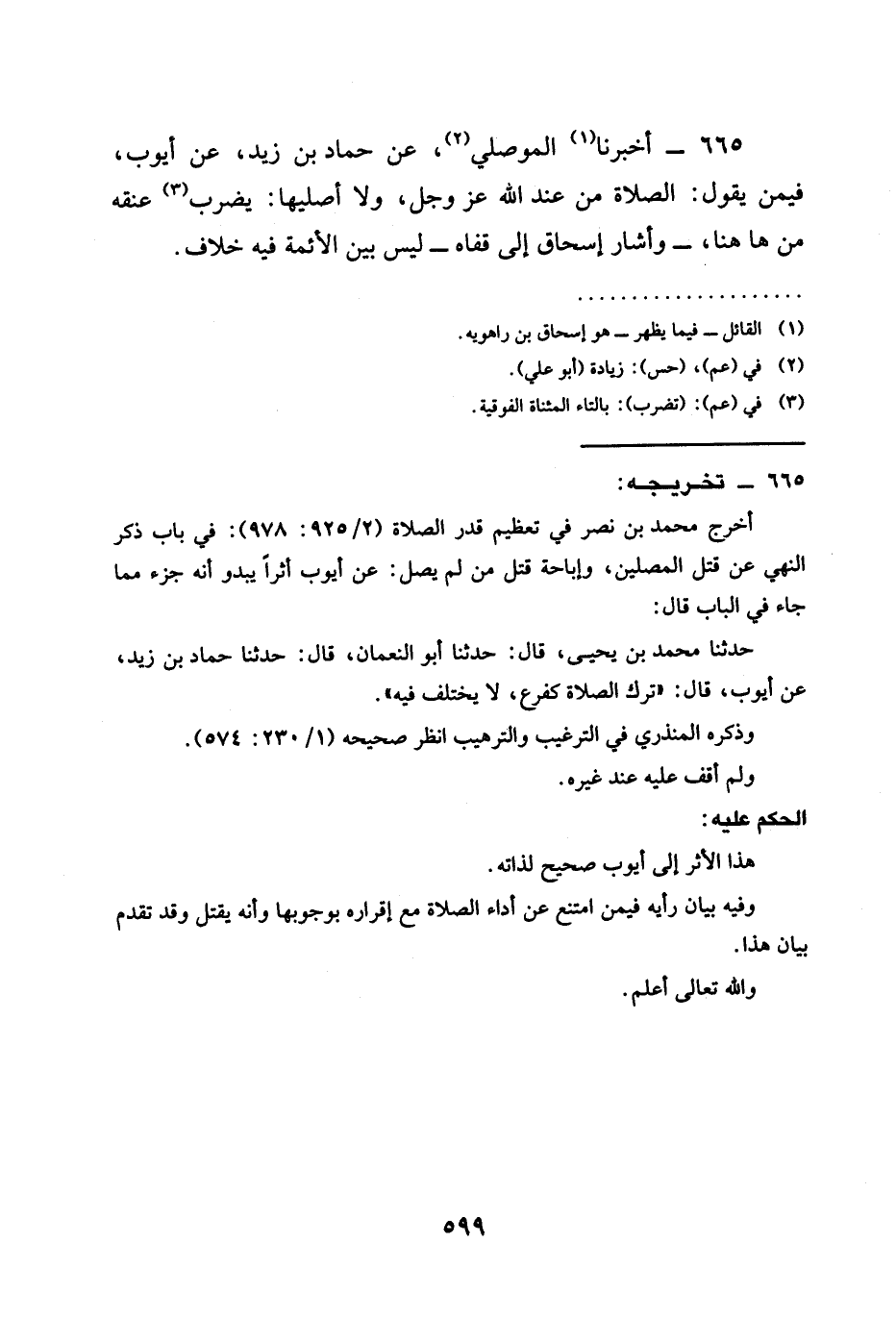665 - أَخْبَرَنَا المَوْصِلِيُّ عَنْ حَمَّادِ بْنِ زَيْدٍ عن أيوب §فيمن يَقُولُ الصَّلَاةُ مِنْ عِنْدِ اللَّهِ عَزَّ وَجَلَّ وَلَا أُصَلِّيهَا يُضْرَبُ عُنُقُهُ مِنْ هَا هُنَا وَأَشَارَ إِسْحَاقُ إِلَى قَفَاهُ لَيْسَ بَيْنَ الْأَئِمَّةِ فِيهِ خِلَافٌ