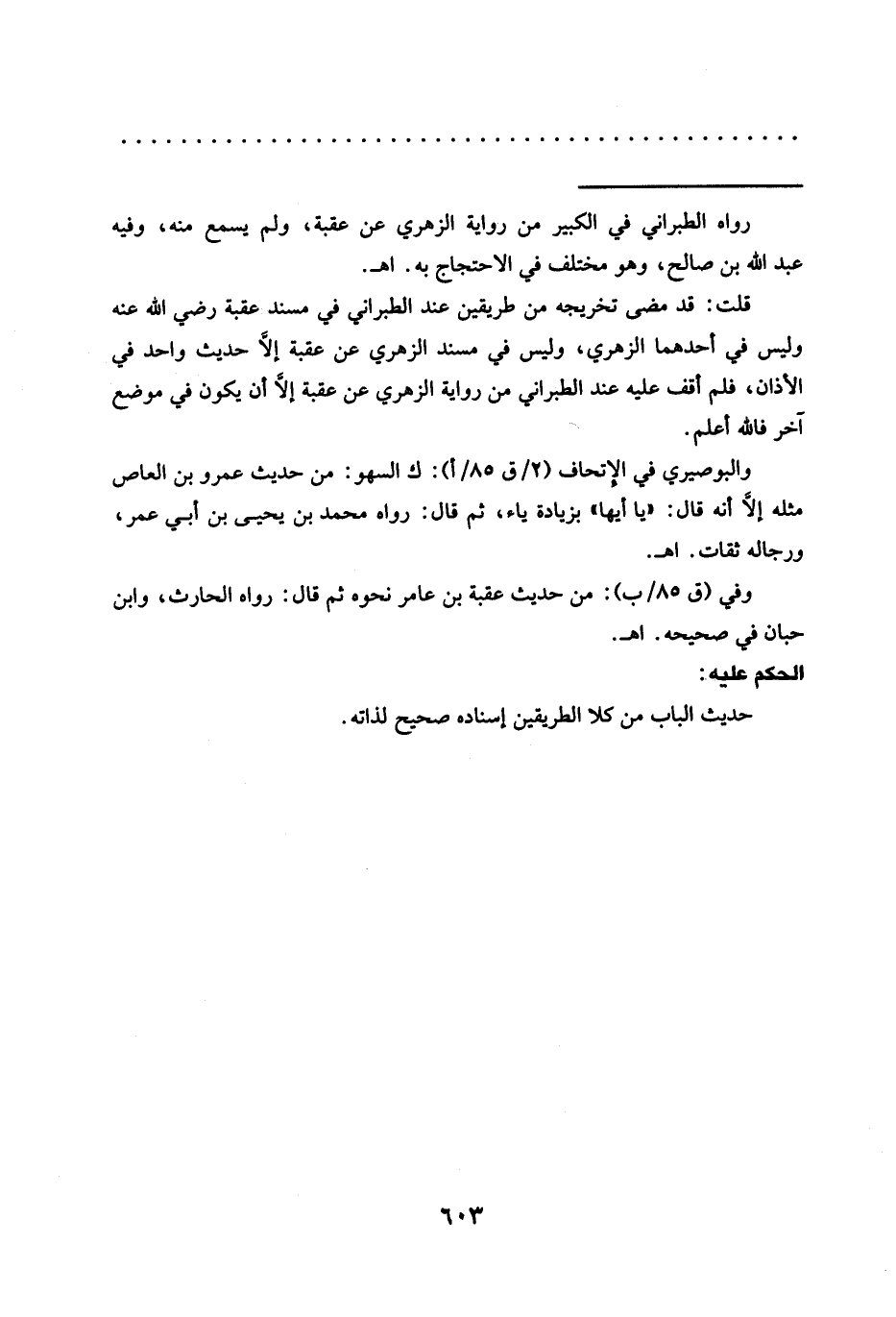 = رواه الطبراني في الكبير من رواية الزهري عن عقبة، ولم يسمع منه، وفيه عبد الله بن صالح، وهو مختلف في الاحتجاج به. اهـ.