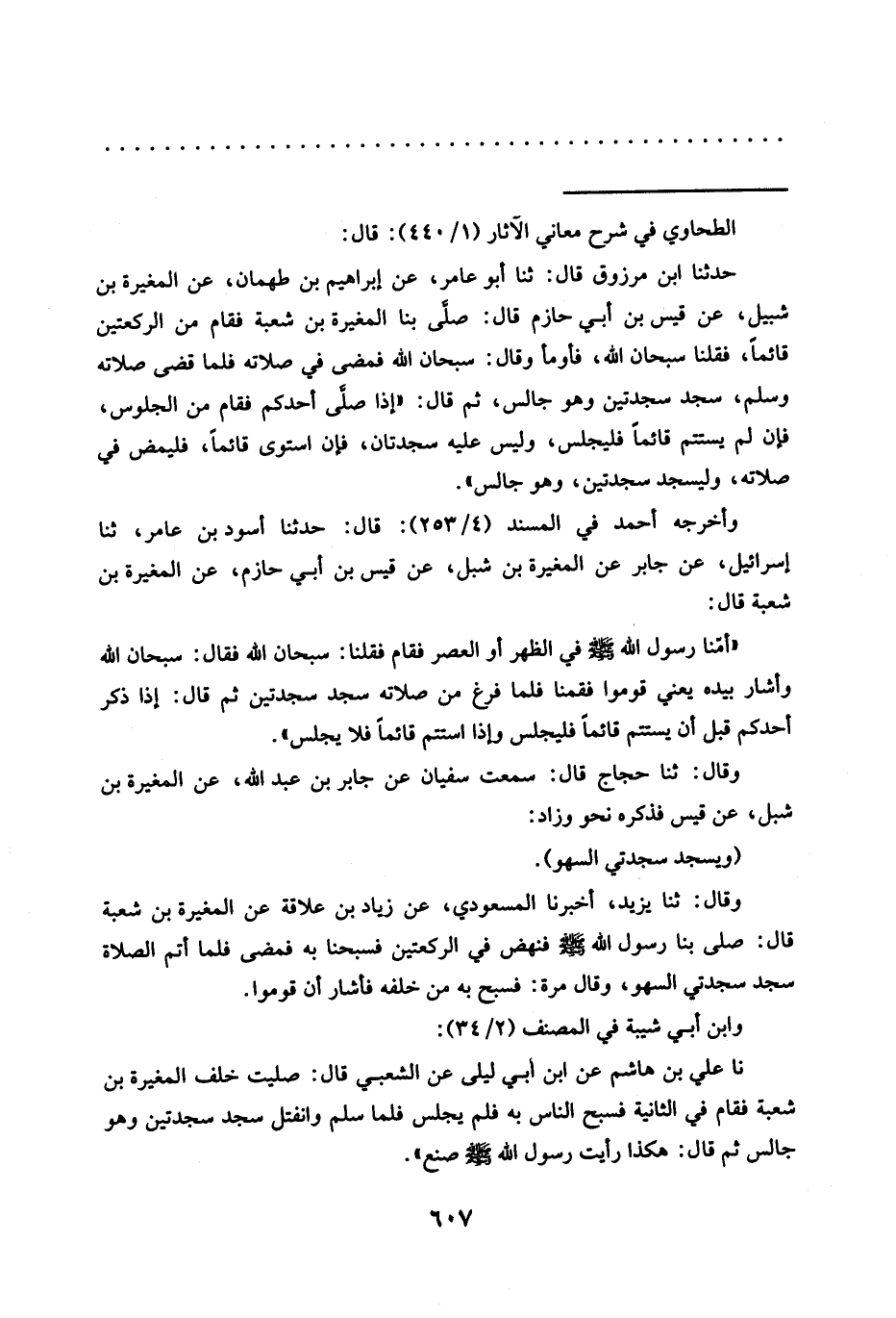 نا عَلِيُّ بْنُ هَاشِمٍ عَنِ ابْنِ أَبِي لَيْلَى عن الشعبي قال: صليت خلف المغيرة بن شعبة فقام في الثانية فسبح الناس به فلم يجلس فلما سلم وانفتل سجد سجدتين وهو جالس ثم قال: هكذا رَأَيْتُ رَسُولَ اللَّهِ -صَلَّى اللَّهُ عَلَيْهِ وَسَلَّمَ- صنع".=