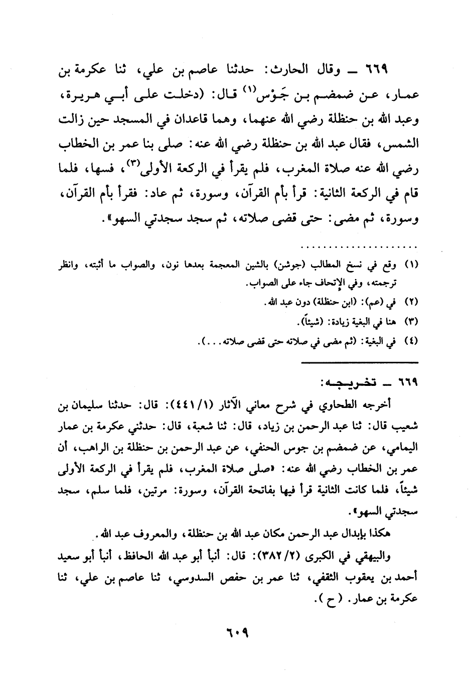 669 - وَقَالَ الْحَارِثُ حَدَّثَنَا عَاصِمُ بْنُ عَلِيٍّ ثنا عِكْرِمَةُ بْنُ عَمَّارٍ عَنْ ضَمْضَمِ بْنِ جَوْسٍ قَالَ (دَخَلْتُ عَلَى أَبِي هُرَيْرَةَ وَعَبْدِ اللَّهِ بْنِ حَنْظَلَةَ رَضِيَ اللَّهُ عَنْهُمَا وَهُمَا قَاعِدَانِ فِي الْمَسْجِدِ حِينَ زَالَتِ الشَّمْسُ فَقَالَ عَبْدُ اللَّهِ بْنُ حَنْظَلَةَ رَضِيَ اللَّهُ عَنْهُ §صَلَّى بِنَا عُمَرُ بْنُ الْخَطَّابِ رَضِيَ اللَّهُ عَنْهُ صلاة المغرب فلم يَقْرَأْ فِي الرَّكْعَةِ الْأُولَى فَسَهَا فَلَمَّا قَامَ فِي الرَّكْعَةِ الثَّانِيَةِ قَرَأَ بِأُمِّ الْقُرْآنِ وَسُورَةٍ ثُمَّ عَادَ فَقَرَأَ بِأُمِّ الْقُرْآنِ وَسُورَةٍ ثُمَّ مَضَى حَتَّى قَضَى صَلَاتَهُ ثُمَّ سَجَدَ سَجْدَتَيِ السَّهْوِ "