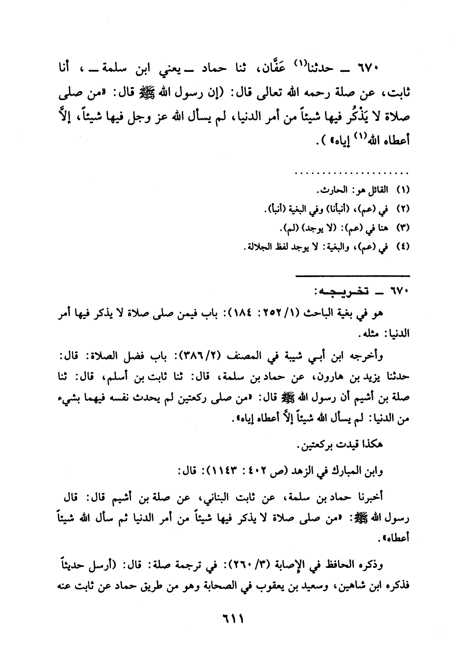 670 - حَدَّثَنَا عَفَّانُ ثنا حَمَّادٌ يَعْنِي ابْنَ سَلَمَةَ أنا ثَابِتٌ عَنْ صِلَةَ رَحِمهَ اللَّهُ تَعَالَى قَالَ (إِنَّ رَسُولَ اللَّهِ صَلَّى اللَّهُ عَلَيْهِ وَسَلَّمَ قَالَ " §مَنْ صَلَّى صَلَاةً لَا يَذْكُرُ فِيهَا شَيْئًا مِنْ أَمْرِ الدُّنْيَا لَمْ يَسْأَلِ اللَّهَ عَزَّ وَجَلَّ فِيهَا شَيْئًا إِلَّا أَعْطَاهُ اللَّهُ إِيَّاهُ ")