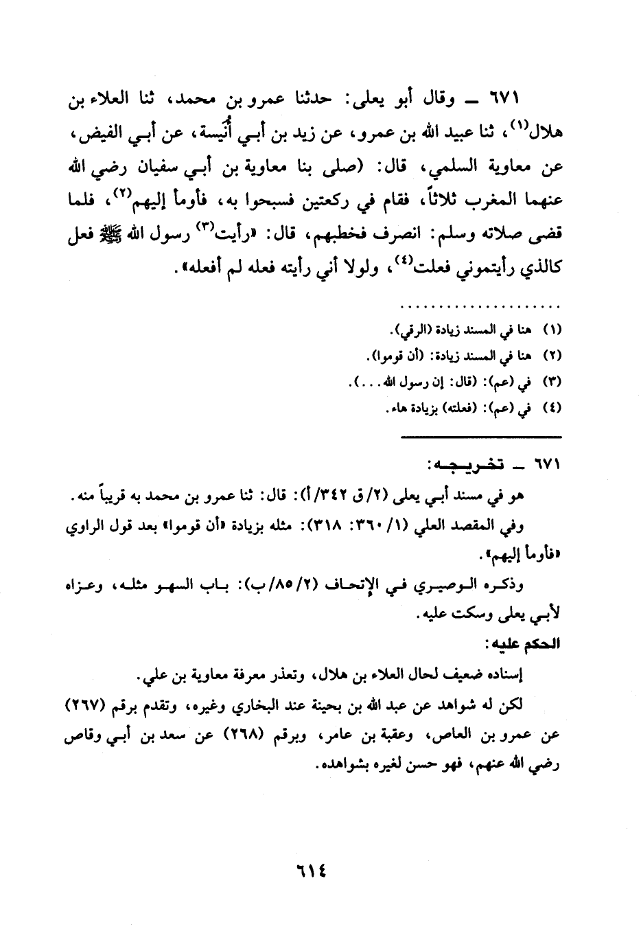 671 - وَقَالَ أَبُو يَعْلَى حَدَّثَنَا عَمْرُو بْنُ مُحَمَّدٍ ثنا الْعَلَاءُ بْنُ هِلَالٍ ثنا عُبَيْدُ اللَّهِ بْنُ عَمْرٍو عَنْ زَيْدِ بْنِ أَبِي أُنَيْسَةَ عَنْ أَبِي الْفَيْضِ عَنْ مُعَاوِيَةَ السُّلَمِيِّ قَالَ (§صَلَّى بِنَا مُعَاوِيَةُ بْنُ أَبِي سُفْيَانَ رَضِيَ اللَّهُ عَنْهُمَا الْمَغْرِبَ ثَلَاثًا فَقَامَ فِي رَكْعَتَيْنِ فَسَبَّحُوا بِهِ فَأَوْمَأَ إِلَيْهِمْ فَلَمَّا قَضَى صَلَاتَهُ وَسَلَّمَ انْصَرَفَ فَخَطَبَهُمْ قَالَ " رَأَيْتُ رَسُولَ اللَّهِ صَلَّى اللَّهُ عَلَيْهِ وَسَلَّمَ فَعَلَ كَالَّذِي رَأَيْتُمُونِي فَعَلْتُ وَلَوْلَا أَنِّي رَأَيْتُهُ فَعَلَهُ لَمْ أَفْعَلْهُ "