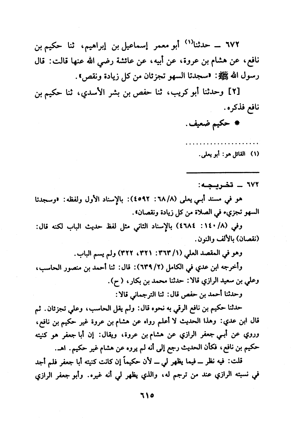 672 -[1] حَدَّثَنَا أَبُو مَعْمَرٍ إِسْمَاعِيلُ بْنُ إِبْرَاهِيمَ ثنا حَكِيمُ بْنُ نَافِعٍ عَنْ هِشَامِ بْنِ عُرْوَةَ عَنْ أَبِيهِ عَنْ عَائِشَةَ رَضِيَ اللَّهُ عَنْهَا قَالَتْ قَالَ رَسُولُ اللَّهِ صَلَّى اللَّهُ عَلَيْهِ وَسَلَّمَ " §سَجْدَتَا السَّهْوِ تُجْزِئَانِ مِنْ كُلِّ زِيَادَةٍ وَنَقْصٍ "