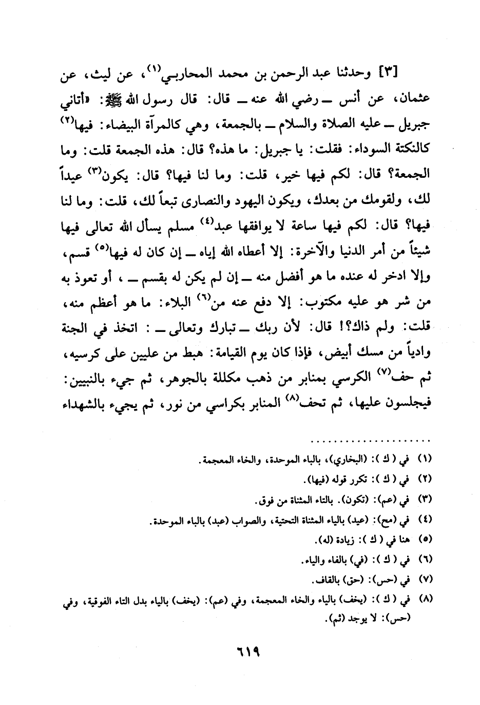 3 - وَحَدَّثَنَا عَبْدُ الرَّحْمَنِ بْنُ مُحَمَّدٍ الْمُحَارِبِيُّ عَنْ لَيْثٍ عَنْ عُثْمَانَ عَنْ أَنَسٍ رَضِيَ اللَّهُ عَنْهُ قَالَ قَالَ رَسُولُ اللَّهِ صَلَّى اللَّهُ عَلَيْهِ وَسَلَّمَ " §أَتَانِي جِبْرِيلُ عَلَيْهِ الصَّلَاةُ وَالسَّلَامُ بِالْجُمُعَةِ وَهِيَ كَالْمِرْآةِ الْبَيْضَاءِ فِيهَا كَالنُّكْتَةِ السَّوْدَاءِ فَقُلْتُ يَا جِبْرِيلُ مَا هَذِهِ قَالَ هَذِهِ الْجُمُعَةُ قُلْتُ وَمَا الْجُمُعَةُ قَالَ لَكُمْ فِيهَا خَيْرٌ قُلْتُ وَمَا لَنَا فِيهَا قَالَ يَكُونُ عِيدًا لَكَ وَلِقَوْمِكَ مِنْ بَعْدَكَ وَيَكُونُ الْيَهُودُ وَالنَّصَارَى تَبَعًا لَكَ قُلْتُ وَمَا لَنَا فِيهَا قَالَ لَكُمْ فِيهَا سَاعَةٌ لَا يُوَافِقُهَا عَبْدٌ مُسْلِمٌ يَسْأَلُ اللَّهَ تَعَالَى فِيهَا شَيْئًا مِنْ أَمْرِ الدُّنْيَا وَالْآخِرَةِ إِلَّا أَعْطَاهُ اللَّهُ إِيَّاهُ إِنْ كَانَ لَهُ فِيهَا قَسْمٌ وَإِلَّا ادَّخَرَ لَهُ عِنْدَهُ مَا هُوَ أَفْضَلُ مِنْهُ إِنْ لَمْ يَكُنْ لَهُ بِقَسْمٍ أَوْ تَعَوَّذَ بِهِ مِنْ شَرٍّ هُوَ عَلَيْهِ مَكْتُوبٌ إِلَّا دَفَعَ عَنْهُ مِنَ الْبَلَاءِ مَا هُوَ أَعْظَمُ مِنْهُ قُلْتُ وَلِمَ ذَاكَ قَالَ لِأَنَّ رَبَّكَ تَبَارَكَ وَتَعَالَى اتَّخَذَ فِي الْجَنَّةِ وَادِيًا مِنْ مِسْكٍ أَبْيَضَ فَإِذَا كَانَ يَوْمُ الْقِيَامَةِ هَبَطَ مِنْ عِلِّيِّينَ عَلَى كُرْسِيِّهِ ثُمَّ حُفَّ الْكُرْسِيُّ بِمَنَابِرَ مِنْ ذَهَبٍ مُكَلَّلَةٍ بالجوهر ثُمَّ جِيءَ بِالنَّبِيِّينَ فَيَجْلِسُونَ عَلَيْهَا ثُمَّ تُحَفُّ الْمَنَابِرُ بِكَرَاسِيَّ مِنْ نُورٍ ثُمَّ يَجِيءُ بِالشُّهَدَاءِ