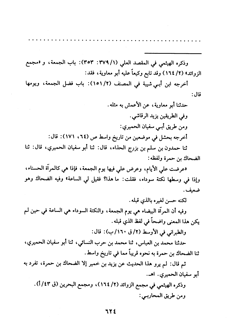 أخرجه بحشل في موضعين من تاريخ واسط ص (64، 171): قال: ثنا حمدون بن سلم بن بزرج الحذاء، قال: ثنا أبو سفيان الحميري، قال: ثنا الضحاك بن حمرة ولفظه: "عرضت علي الأيام، وعرض علي فيها يَوْمُ الْجُمُعَةِ، فإِذا هِيَ كَالْمِرْآةِ الْحَسْنَاءِ، وَإِذَا فِي وَسَطِهَا نُكْتَةٌ سَوْدَاءُ، فَقُلْتُ: مَا هَذَا؟ فقيل لي الساعة" وفيه الضحاك وهو ضعيف.