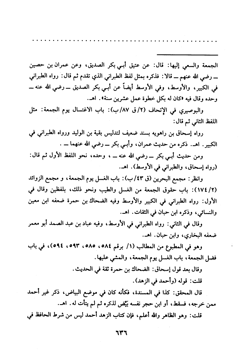 وانظر: مجمع البحرين (ق 43/ ب): باب الغسل يوم الجمعة، ومجمع الزوائد (2/ 174): باب حقوق الجمعة من الغسل والطيب ونحو ذلك، بلفظين وقال في الأول: رواه الطبراني في الكبير والأوسط وفيه الضحاك بن حمرة ضعفه ابن معين والنسائي، وذكره ابن حبان في الثقات. اهـ.
