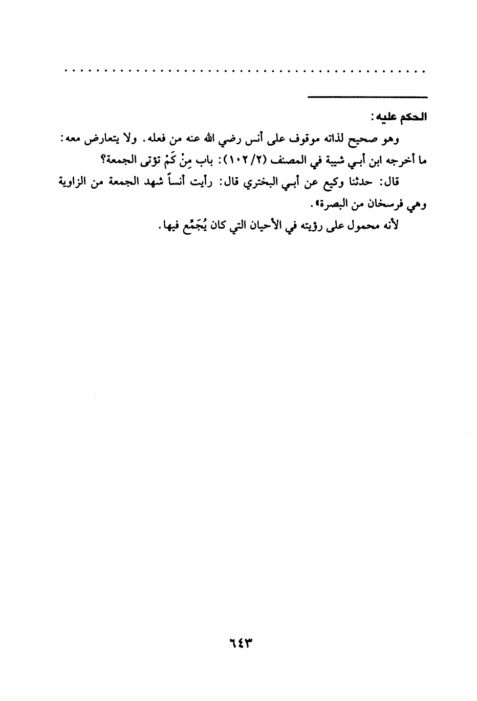 وهو صحيح لذاته موقوف على أنس رضي الله عنه من فعله. ولا يتعارض معه: ما أخرجه ابن أبي شيبة في المصنف (2/ 102): باب مِنْ كَم تؤتى الجمعة؟