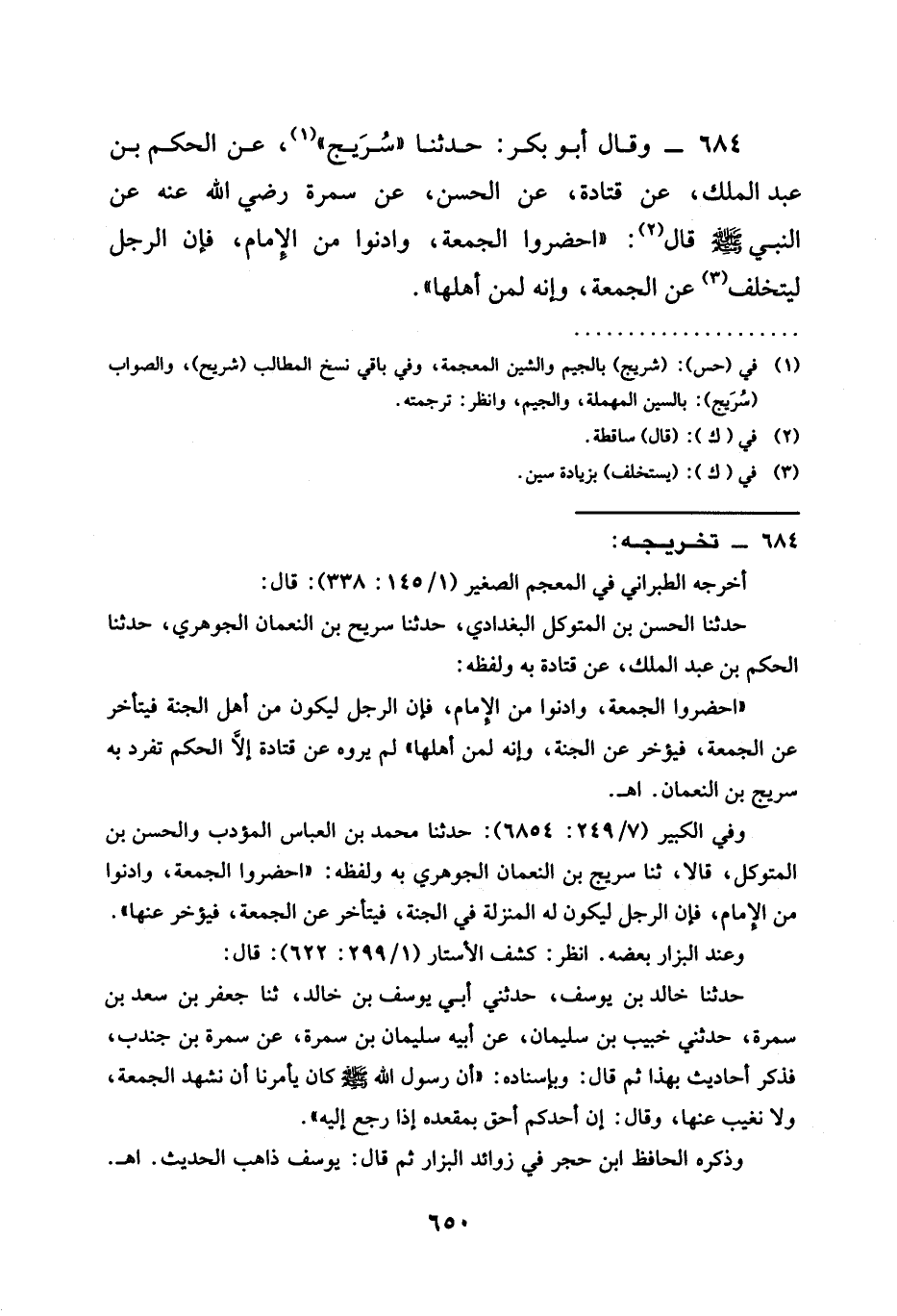 684 - وَقَالَ أَبُو بَكْرٍ حَدَّثَنَا سُرَيْجٌ عَنْ الْحَكَمِ بْنِ عَبْدِ الْمَلِكِ عَنْ قَتَادَةَ عَنِ الْحَسَنِ عَنْ سَمُرَةَ رَضِيَ اللَّهُ عَنْهُ عَنْ النَّبِيِّ صَلَّى اللَّهُ عَلَيْهِ وَسَلَّمَ قَالَ " §احْضُرُوا الْجُمُعَةَ وَادْنُوا مِنَ الْإِمَامِ فَإِنَّ الرَّجُلَ لَيَتَخَلَّفُ عَنِ الْجُمُعَةِ وَإِنَّهُ لَمِنْ أَهْلِهَا "