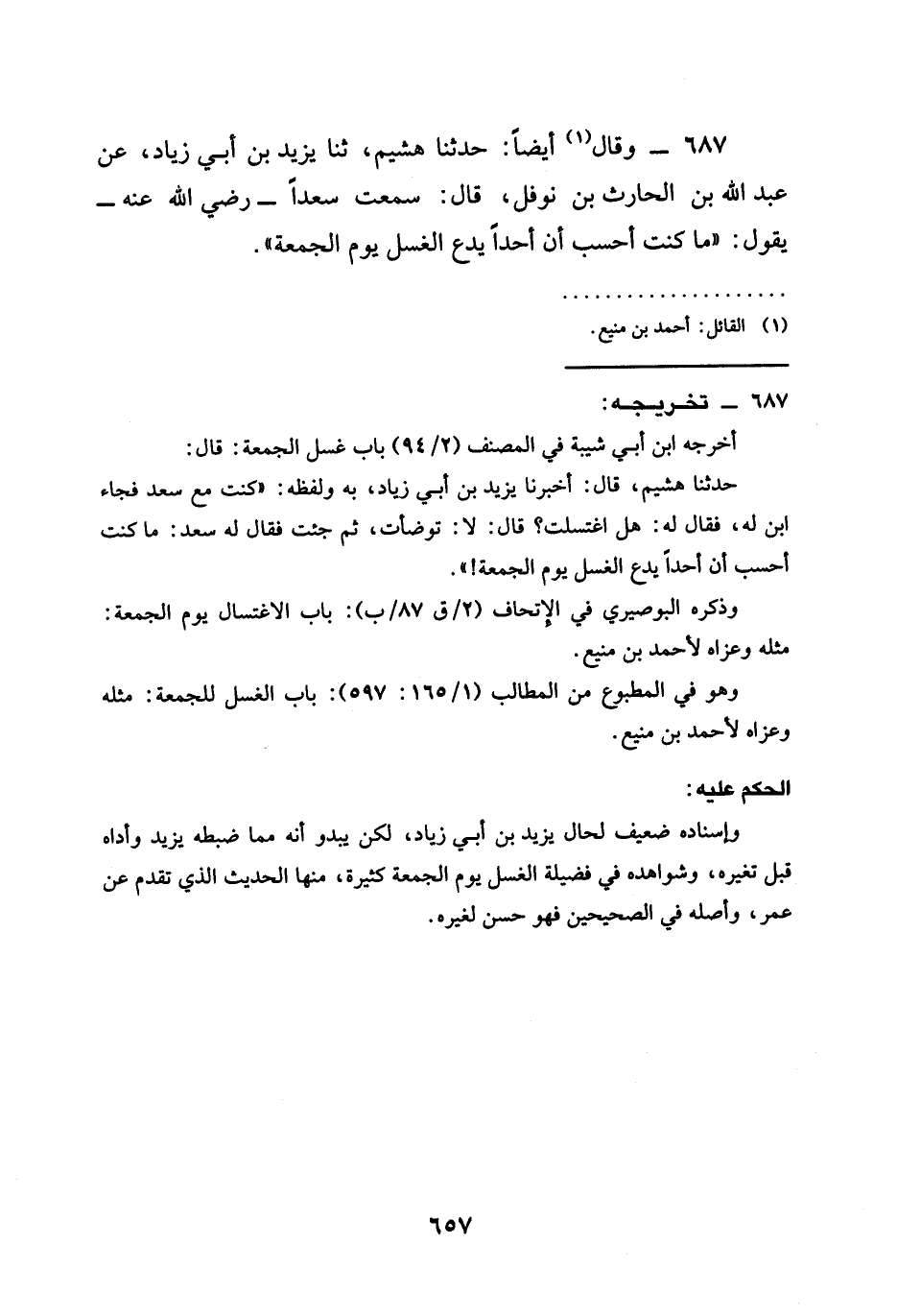 687 - وَقَالَ أَيْضًا حَدَّثَنَا هُشَيْمٌ ثنا يَزِيدُ بْنُ أَبِي زِيَادٍ عَنْ عَبْدِ اللَّهِ بْنِ الْحَارِثِ بْنِ نَوْفَلٍ قَالَ سمعت سعدا رَضِيَ الله عَنْه يَقُولُ " §مَا كُنْتُ أَحْسِبُ أَنْ أَحَدًا يَدَعُ الْغُسْلَ يَوْمَ الْجُمُعَةِ "