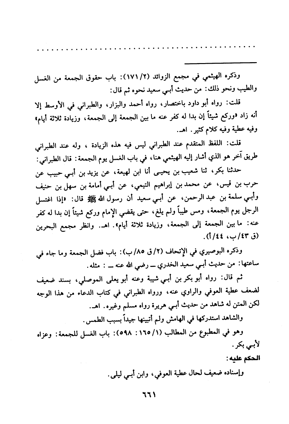 حدثنا بكر، ثنا شعيب بن يحيى أنا ابْنُ لَهِيعَةَ، عَنْ يَزِيدَ بْنِ أَبِي حَبِيبٍ عن حرب بن قيس، عَنْ مُحَمَّدِ بْنِ إِبْرَاهِيمَ التَّيْمِيِّ، عَنْ أَبِي أُمَامَةَ بْنِ سَهْلِ بْنِ حُنَيْفٍ وأبي سَلَمَةَ بْنِ عَبْدِ الرَّحْمَنِ، عَنْ أَبِي سَعِيدٍ إِنَّ رَسُولَ اللَّهِ -صَلَّى اللَّهُ عليه وسلم- قال: "إذا اغتسل الرجل يوم الجمعة، ومس طيبًا ولم يلغ، حتى يقضي الإِمام وركع شيئًا إن بدا له كفر عنه: ما بين الجمعة إلى الجمعة، وزيادة ثلاثة أيام". اهـ. وانظر مجمع البحرين (ق 43/ ب، 44/ أ).