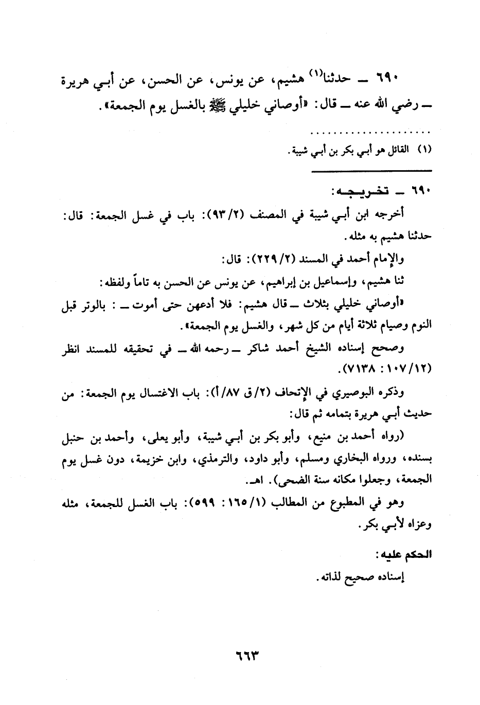 690 - حَدَّثَنَا هُشَيْمٌ عَنْ يُونُسَ عَنِ الْحَسَنِ عَنْ أَبِي هُرَيْرَةَ رَضِيَ الله عَنْهُ قَالَ " §أَوْصَانِي خَلِيلِي صَلَّى اللَّهُ عَلَيْهِ وَسَلَّمَ بِالْغُسْلِ يَوْمَ الْجُمُعَةِ "