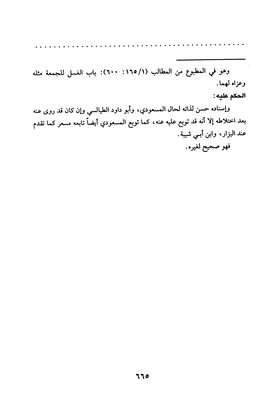 وإسناده حسن لذاته لحال المسعودي، وأبو داود الطيالسي وإن كان قد روى عنه بعد اختلاطه إلا أنه قد توبع عليه عنه، كما توبع المسعودي أيضًا تابعه مسعر كما تقدم عند البزار، وابن أبي شيبة.