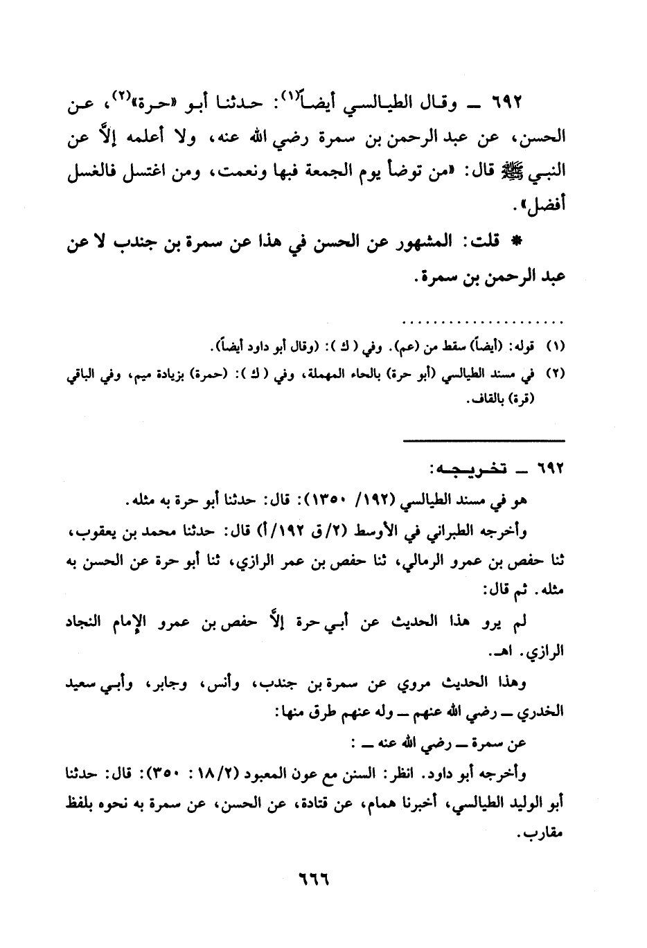 692 - وَقَالَ الطَّيَالِسِيُّ أَيْضًا حَدَّثَنَا أَبُو حَرَّةَ عَنِ الْحَسَنِ عَنْ عَبْدِ الرَّحْمَنِ بْنِ سَمُرَةَ رَضِيَ الله عَنْهُ وَلَا أَعْلَمُهُ إِلَّا عَنِ النَّبِيِّ صَلَّى اللَّهُ عَلَيْهِ وَسَلَّمَ قَالَ " §مَنْ تَوَضَّأَ يَوْمَ الْجُمُعَةِ فَبِهَا وَنِعْمَتْ وَمَنِ اغْتَسَلَ فَالْغُسْلُ أَفْضَلُ " قُلْتُ الْمَشْهُورُ عَنِ الْحَسَنِ فِي هَذَا عَنْ سَمُرَةَ بْنِ جُنْدُبٍ لَا عَنْ عَبْدِ الرَّحْمَنِ بْنِ سَمُرَةَ