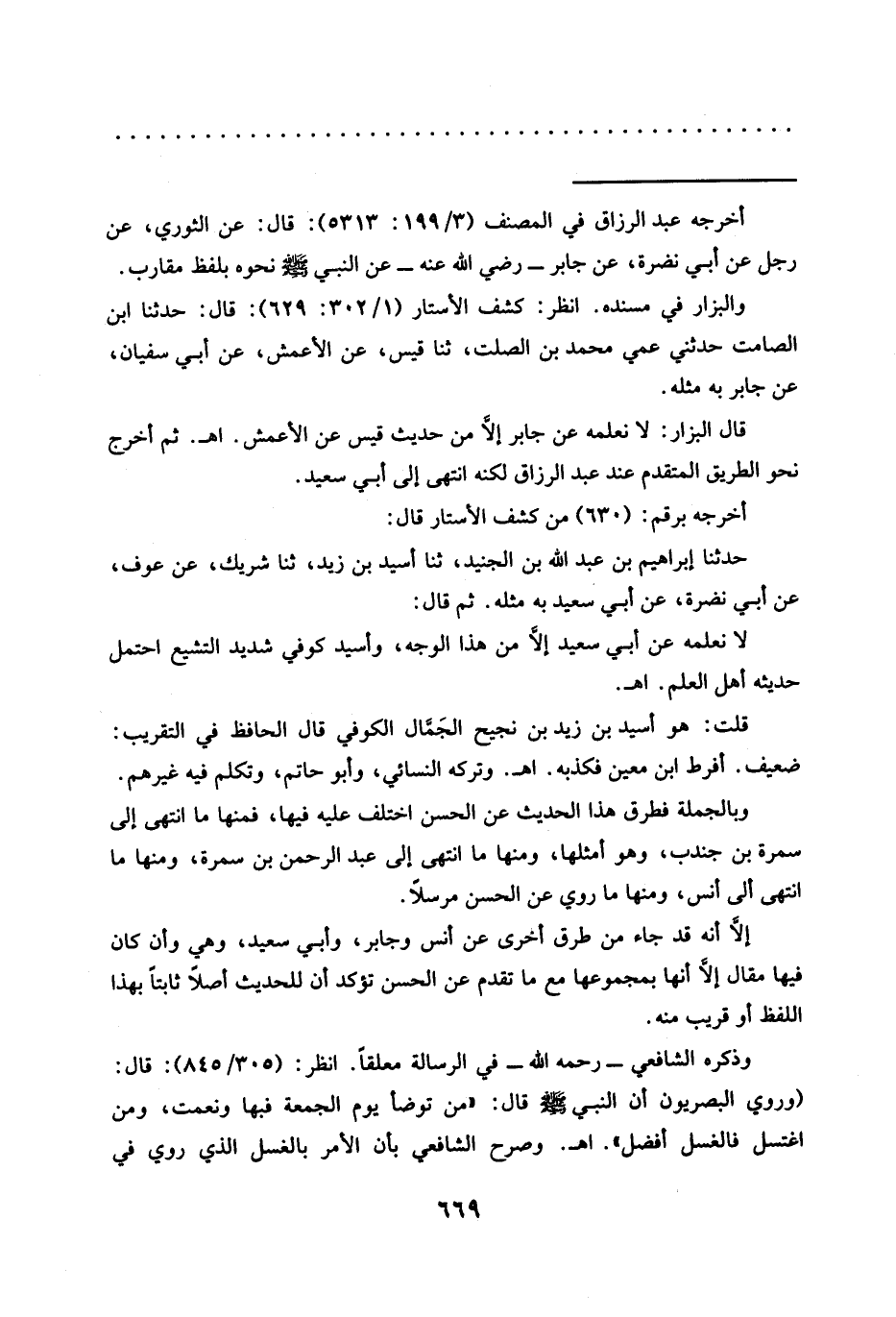 = أخرجه عبد الرزاق في المصنف (3/ 199: 5313): قال: عن الثوري، عن رجل عَنْ أَبِي نَضْرَةَ، عَنْ جَابِرٍ -رَضِيَ اللَّهُ عنه- عَنِ النَّبِيِّ -صَلَّى اللَّهُ عَلَيْهِ وَسَلَّمَ- نَحْوَهُ بلفظ مقارب.