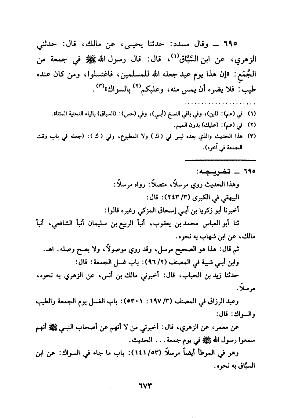 695 - وَقَالَ مُسَدَّدٌ حَدَّثَنَا يَحْيَى عَنْ مَالِكٍ قَالَ حَدَّثَنِي الزُّهْرِيُّ عَنِ ابْنِ السَّبَّاقِ قَالَ قَالَ رَسُولُ اللَّهِ صَلَّى اللَّهُ عَلَيْهِ وَسَلَّمَ فِي جُمُعَةٍ مِنَ الْجُمَعِ " إِنَّ §هَذَا يَوْمُ عِيدٍ جَعَلَهُ اللَّهُ لِلْمُسْلِمِينَ فَاغْتَسِلُوا وَمَنْ كَانَ عِنْدَهُ طِيبٌ فَلَا يَضُرُّهُ أَنْ يَمَسَّ مِنْهُ وَعَلَيْكُمْ بِالسِّوَاكِ