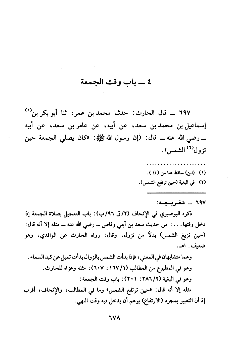 697 - قَالَ الْحَارِثُ حَدَّثَنَا مُحَمَّدُ بْنُ عُمَرَ ثنا أَبُو بَكْرِ بْنُ إِسْمَاعِيلَ بْنِ مُحَمَّدِ بْنِ سَعْدٍ عَنْ أَبِيهِ عَنْ عَامِرِ بْنِ سَعْدٍ عَنْ أَبِيهِ رَضِيَ الله عَنْهُ قَالَ (إِنَّ رَسُولَ اللَّهِ صَلَّى اللَّهُ عَلَيْهِ وَسَلَّمَ " §كَانَ يُصَلِّي الْجُمُعَةَ حِينَ تَزُولُ الشَّمْسُ "
