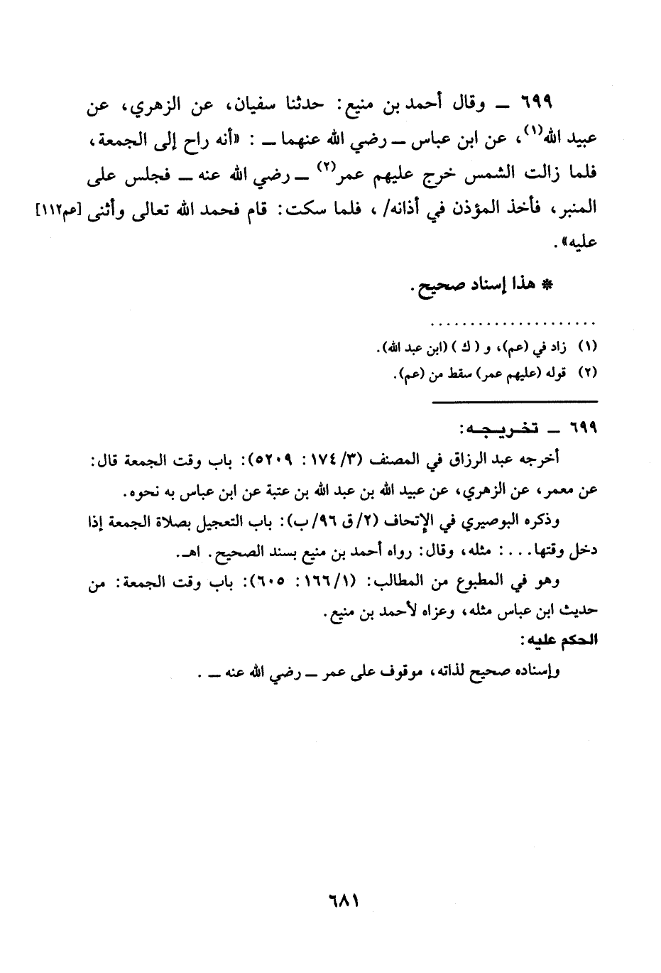 699 - وَقَالَ أَحْمَدُ بْنُ مَنِيعٍ حَدَّثَنَا سُفْيَانُ عَنِ الزُّهْرِيِّ عَنْ عُبَيْدِ اللَّهِ عَنِ ابْنِ عَبَّاسٍ رَضِيَ الله عَنْهُمَا " أَنَّهُ §رَاحَ إِلَى الْجُمُعَةِ فَلَمَّا زَالَتِ الشَّمْسُ خَرَجَ عَلَيْهِمْ عُمَرُ رَضِيَ الله عَنْهُ فَجَلَسَ عَلَى الْمِنْبَرِ فَأَخَذَ الْمُؤَذِّنُ فِي أَذَانِهِ فَلَمَّا سَكَتَ قَامَ فَحَمِدَ اللَّهَ تَعَالَى وَأَثْنَى عَلَيْهِ "