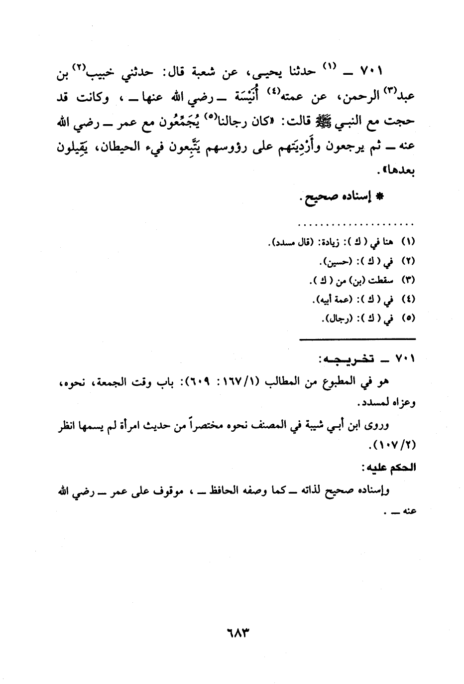 701 - حَدَّثَنَا يَحْيَى عَنْ شُعْبَةَ قَالَ حَدَّثَنِي خُبَيْبُ بْنُ عَبْدِ الرَّحْمَنِ عَنْ عَمَّتِهِ أُنَيْسَةَ رَضِيَ الله عَنْهَا وَكَانَتْ قَدْ حَجَّتْ مَعَ النَّبِيِّ صَلَّى اللَّهُ عَلَيْهِ وَسَلَّمَ قَالَتْ " كَانَ §رِجَالُنَا يُجَمِّعُونَ مَعَ عُمَرَ رَضِيَ الله عَنْهُ ثُمَّ يَرْجِعُونَ وَأَرْدِيَتُهُمْ عَلَى رؤوسهم يَتَّبِعُونَ فَيْءَ الْحِيطَانِ يَقِيلُونَ بَعْدَهَا "