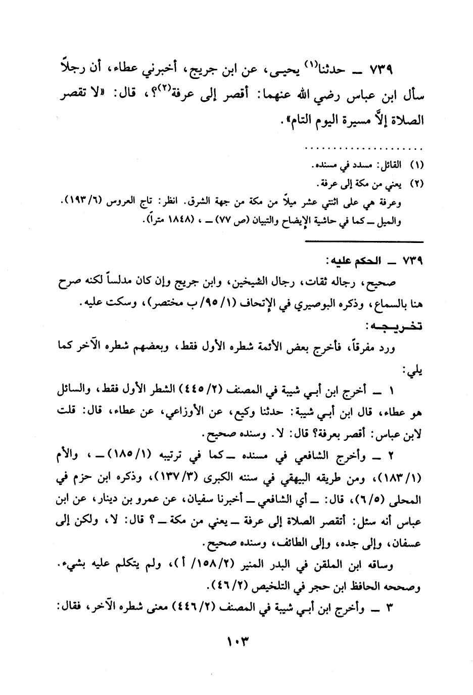 739 - حَدَّثَنَا يَحْيَى عَنِ ابْنِ جُرَيْجٍ أَخْبَرَنِي عَطَاءٌ أَنَّ رَجُلًا سَأَلَ ابْنَ عَبَّاسٍ رَضِيَ الله عَنْهُمَا أَقْصُرُ إِلَى عَرَفَةَ قَالَ §لَا تُقْصَرُ الصَّلَاةُ إِلَّا مَسِيرَةَ الْيَوْمِ التَّامِّ