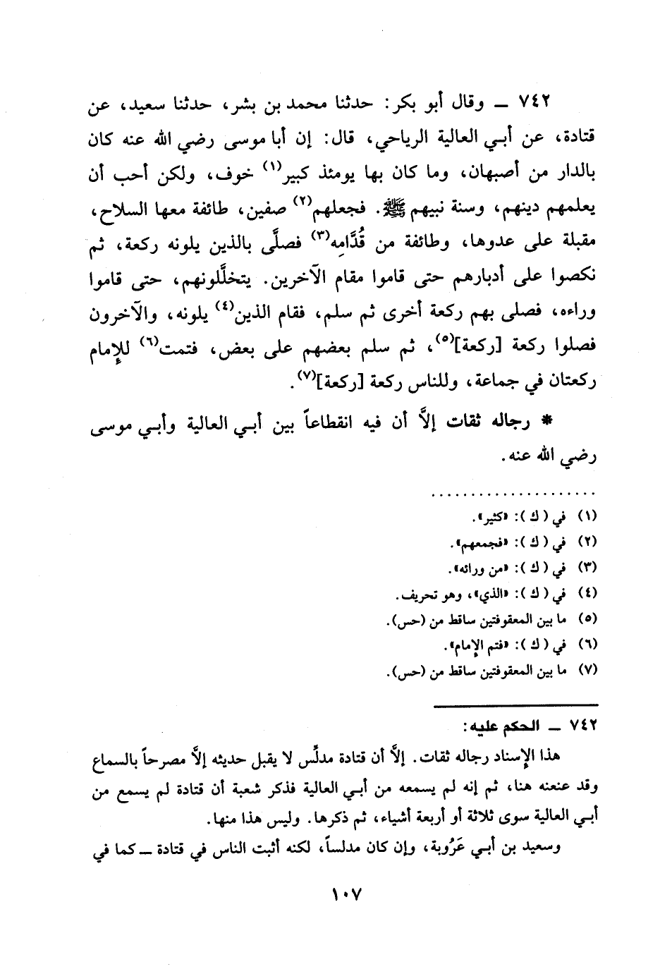 حَدَّثَنَا مُحَمَّدُ بْنُ بِشْرٍ حَدَّثَنَا سَعِيدٌ عَنْ قَتَادَةَ عَنْ أَبِي الْعَالِيَةِ الرِّيَاحِيِّ قَالَ إِنَّ أَبَا مُوسَى رَضِيَ الله عَنْهُ كَانَ بِالدَّارِ مِنْ أَصْبَهَانَ وَمَا كَانَ بِهَا يَوْمَئِذٍ كَبِيرُ خَوْفٍ وَلَكِنْ §أَحَبَّ أَنْ يُعَلِّمَهُمْ دِينَهُمْ وَسُنَّةَ نَبِيِّهِمْ صَلَّى اللَّهُ عَلَيْهِ وَسَلَّمَ فَجَعَلَهُمْ صَفَّيْنِ طَائِفَةً مَعَهَا السِّلَاحُ مُقْبِلَةً عَلَى عَدُوِّهَا وَطَائِفَةً مِنْ قُدَّامِهِ فَصَلَّى بِالَّذِينَ يَلُونَهُ رَكْعَةً ثُمَّ نَكَصُوا عَلَى أَدْبَارِهِمْ حَتَّى قَامُوا مَقَامَ الْآخَرِينَ يَتَخَلَّلُونَهُمْ حَتَّى قَامُوا وَرَاءَهُ فَصَلَّى بِهِمْ رَكْعَةً أُخْرَى ثُمَّ سَلَّمَ فَقَامَ الَّذِينَ يَلُونَهُ وَالْآخَرُونَ فَصَلُّوا رَكْعَةً ثُمَّ سَلَّمَ بَعْضُهُمْ عَلَى بَعْضٍ فَتَمَّتْ لِلْإِمَامِ رَكْعَتَانِ فِي جَمَاعَةٍ وَلِلنَّاسِ رَكْعَةً رَكْعَةً رِجَالُهُ ثِقَاتٌ إِلَّا أَنَّ فِيهِ انْقِطَاعًا بَيْنَ أَبِي الْعَالِيَةِ وَأَبِي مُوسَى رَضِيَ الله عَنْهُ