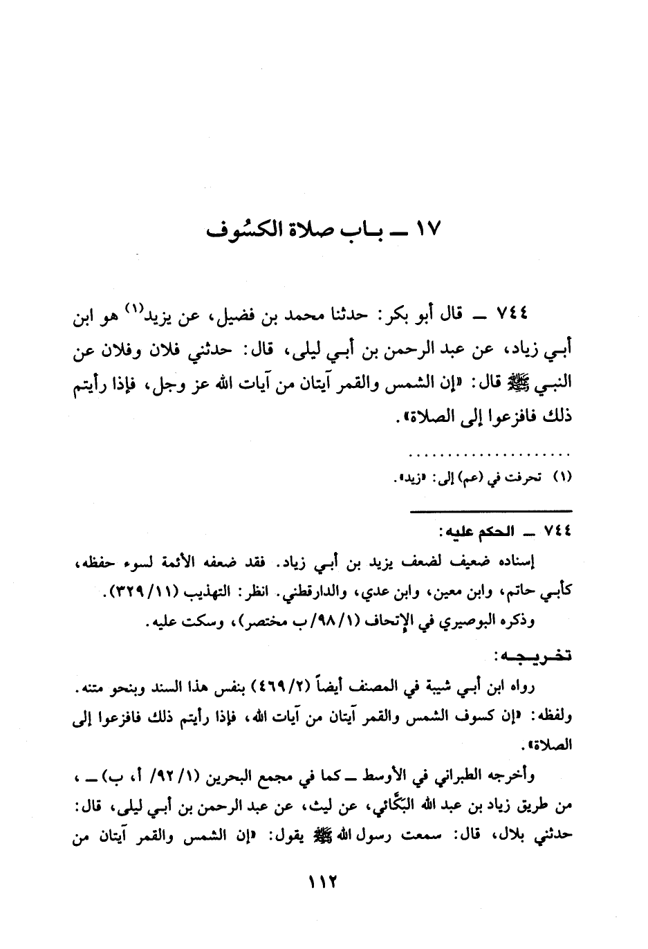 حَدَّثَنَا مُحَمَّدُ بْنُ فُضَيْلٍ عَنْ يَزِيدَ هُوَ ابْنُ أَبِي زِيَادٍ عَنْ عَبْدِ الرَّحْمَنِ بْنِ أَبِي لَيْلَى قال حدثني فلاة وفلان عَنِ النَّبِيِّ صَلَّى اللَّهُ عَلَيْهِ وَسَلَّمَ قَالَ إِنَّ §الشَّمْسَ وَالْقَمَرَ آيَتَانِ مِنْ آيَاتِ اللَّهِ عَزَّ وَجَلَّ فَإِذَا رَأَيْتُمْ ذَلِكَ فَافْزَعُوا إِلَى الصَّلَاةِ