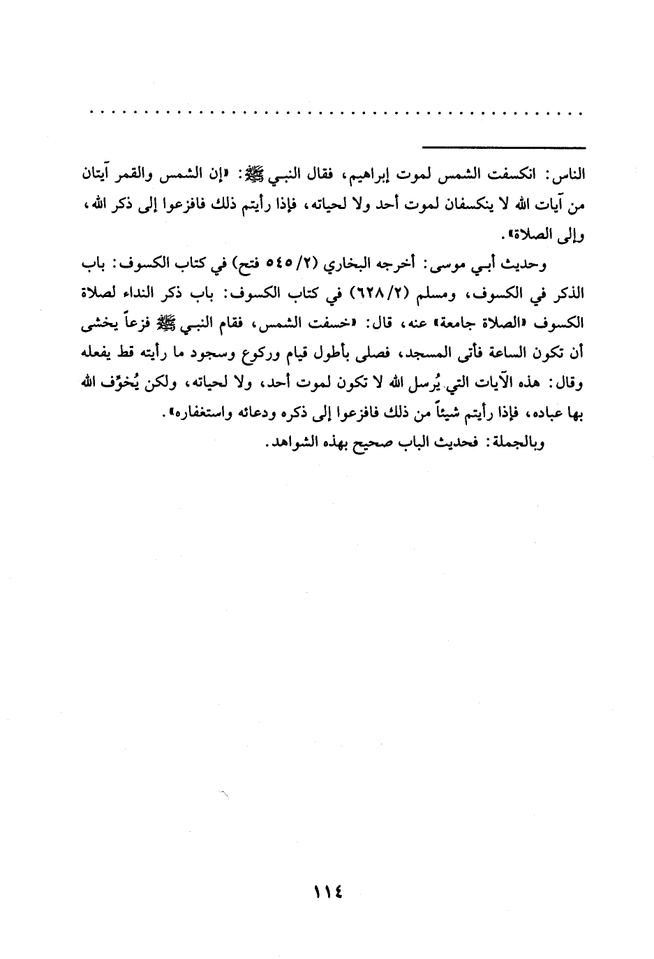 وحديث أبي موسى: أخرجه البخاري (2/ 545 فتح) في كتاب الكسوف: باب الذكر في الكسوف، ومسلم (2/ 628) في كتاب الكسوف: باب ذكر النداء لصلاة الكسوف "الصلاة جامعة" عنه، قال: "خسفت الشمس، فقام النبي -صلى الله عليه وسلم- فزعًا يخشى أن تكون الساعة فأتى المسجد، فصلى بأطول قيام وركوع وسجود ما رأيته قط يفعله وقال: هذه الآيات التي، يُرسل الله لا تكون لموت أحد، ولا لحياته، ولكن يُخوِّف الله بها عباده، فإِذا رأيتم شيئًا من ذلك فافزعوا إلى ذكره ودعائه واستغفاره". وبالجملة: فحديث الباب صحيح بهذه الشواهد.