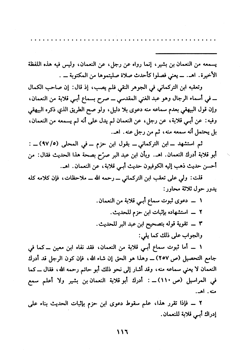 وتعقبه ابن التركماني في الجوهر النقي فلم يصب، إذ قال: إن صاحب الكمال -في أسماء الرجال وهو عبد الغني المقدسي- صرح بسماع أبي قلابة من النعمان، وإن قول البيهقي بعدم سماعه منه دعوى بلا دليل، ولو صح الطريق الذي ذكره البيهقي وفيه: عن أبي قلابة، عن رجل، عن النعمان لم يدل على أنه لم يسمعه من النعمان، بل يحتمل أنه سمعه منه، ثم من رجل عنه. اهـ.