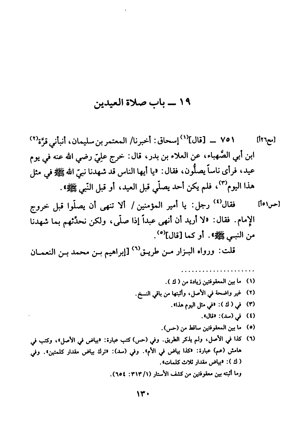 أَخْبَرَنَا الْمُعْتَمِرُ بْنُ سُلَيْمَانَ أَنْبَأَنِي قُرَّةُ ابن أَبِي الصَّهْبَاءِ عَنِ الْعَلَاءِ بْنِ بَدْرٍ قَالَ خَرَجَ عَلِيٌّ رَضِيَ الله عَنْهُ فِي يَوْمِ عِيدٍ فَرَأَى نَاسًا يُصَلُّونَ فَقَالَ يَا أَيُّهَا النَّاسُ قَدْ شَهِدْنَا نَبِيَّ اللَّهِ صَلَّى اللَّهُ عَلَيْهِ وَسَلَّمَ فِي مِثْلِ هَذَا الْيَوْمِ §فَلَمْ يَكُنْ أَحَدٌ يُصَلِّي قَبْلَ الْعِيدِ أَوْ قَبْلَ النَّبِيِّ صَلَّى اللَّهُ عَلَيْهِ وَسَلَّمَ فَقَالَ رَجُلٌ يَا أَمِيرَ الْمُؤْمِنِينَ أَلَا تَنْهَى أَنْ يُصَلُّوا قَبْلَ خُرُوجِ الْإِمَامِ فَقَالَ لَا أُرِيدُ أن أنهى عبد إِذَا صَلَّى وَلَكِنْ نُحَدِّثُهُمْ بِمَا شَهِدْنَا مِنْ النَّبِيِّ صَلَّى اللَّهُ عَلَيْهِ وَسَلَّمَ أَوْ كَمَا قَالَ قُلْتُ ورَوَاهُ الْبَزَّارُ مِنْ طَرِيقِ إِبْرَاهِيمَ بْنِ مُحَمَّدِ النُّعْمَانِ