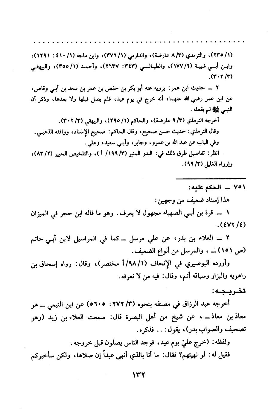 2 - حديث ابن عمر: يرويه عنه أبو بكر بن حفص بن عمر بن سعد بن أبي وقاص، عن ابن عمر رضي الله عنهما، أنه خرج في يوم عيد، فلم يصل قبلها ولا بعدها، وذكر أن النبي -صلى الله عليه وسلم- لم يفعله.