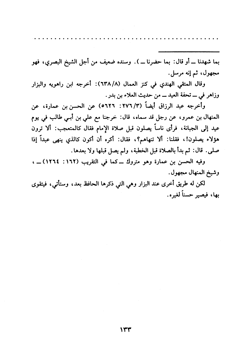 وأخرجه عبد الرزاق أيضًا (3/ 276: 5626) عن الحسن بن عمارة، عن المنهال بن عمرو، عن رجل قد سماه، قال: خرجنا مع علي بن أبي طالب في يوم عيد إلى الجبانة، فرأى ناسًا يصلون قبل صلاة الإِمام فقال كالمتعجب: ألا ترون هؤلاء يصلون!، فقلنا: ألا تنهاهم؟، فقال: أكره أن أكون كالذي ينهى عبدًا إذا صلى. قال: ثم بدأ بالصلاة قبل الخطبة، ولم يصل قبلها ولا بعدها.