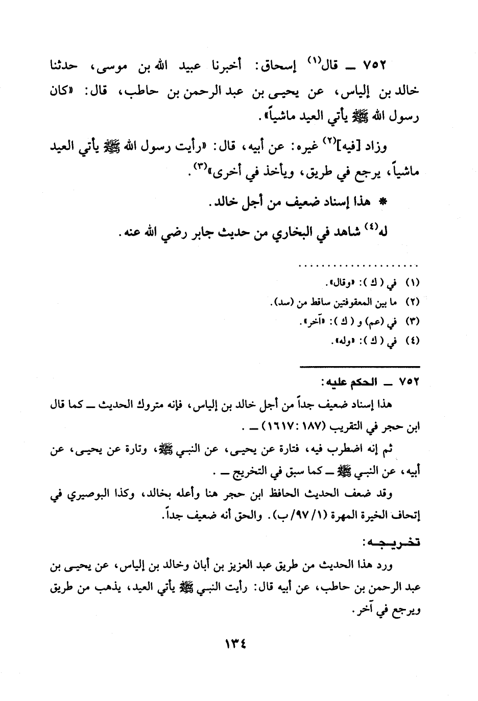 أَخْبَرَنَا عُبَيْدُ اللَّهِ بْنُ مُوسَى حَدَّثَنَا خَالِدُ بْنُ إِلْيَاسَ عَنْ يَحْيَى بْنِ عَبْدِ الرَّحْمَنِ بْنِ حاطب قال: §كَانَ رَسُولُ اللَّهِ صَلَّى اللَّهُ عَلَيْهِ وَسَلَّمَ يَأْتِي الْعِيدَ مَاشِيًا