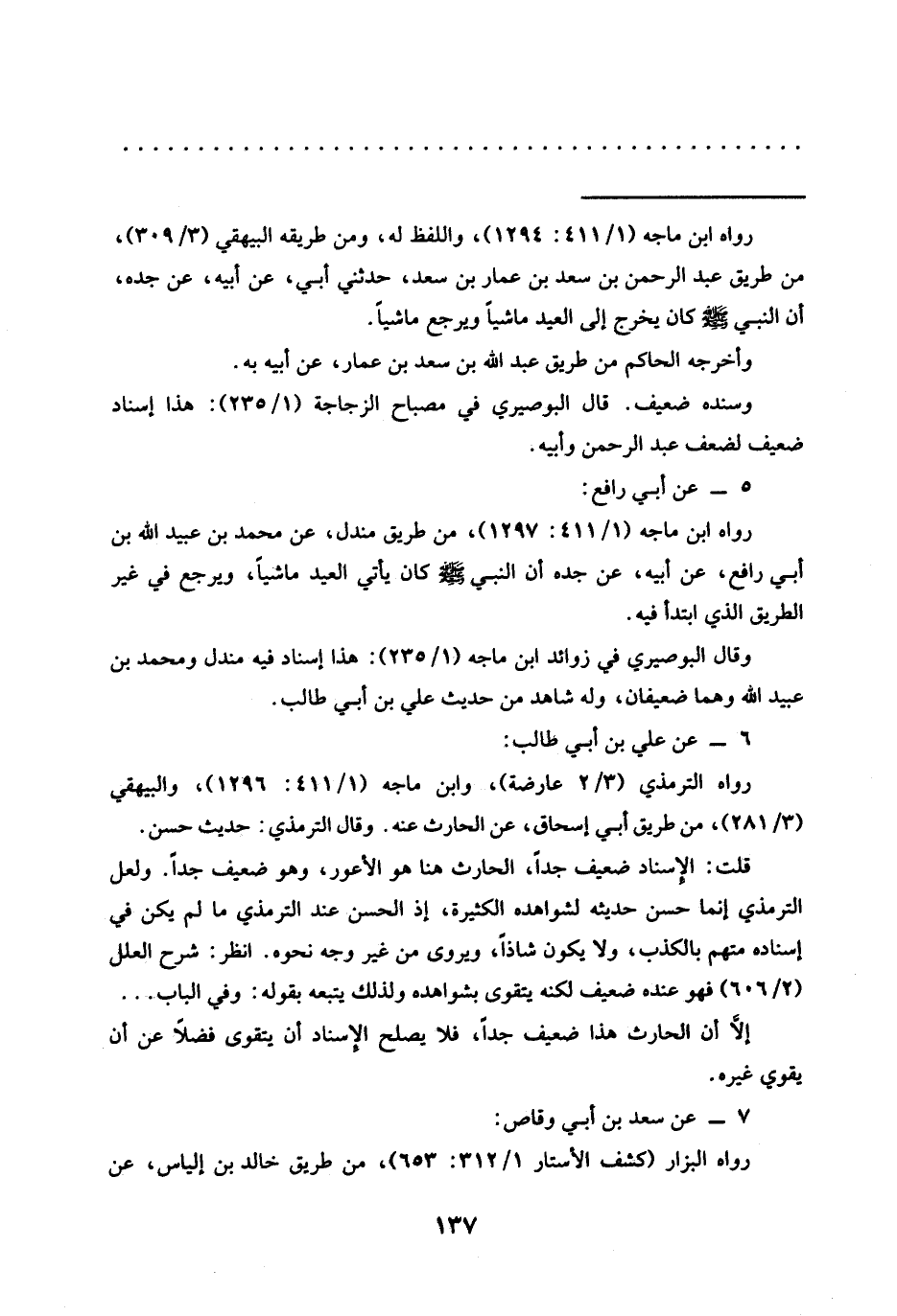 = رواه ابن ماجه (1/ 411: 1294)، واللفظ له، ومن طريقه البيهقي (3/ 309)، من طريق عبد الرحمن بن سعد بن عمار بن سعد، حدثني أبي، عن أبيه، عَنْ جَدِّهِ، أَنَّ النَّبِيَّ -صَلَّى اللَّهُ عَلَيْهِ وسلم-كان يخرج إلى العيد ماشيًا ويرجع ماشيًا.