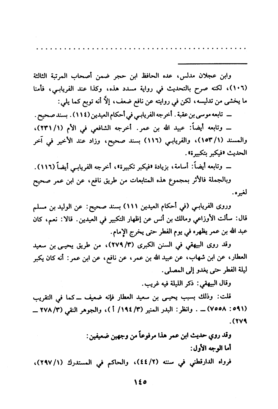 وروى الفريابي (في أحكام العيدين 111) بسند صحيح: عن الوليد بن مسلم قال: سألت الأرزاعي ومالك بن أنس عن إظهار التكبير في العيدين. قالا: نعم، كان عبد الله بن عمر يظهره في يوم الفطر حتى يخرج الإِمام.
