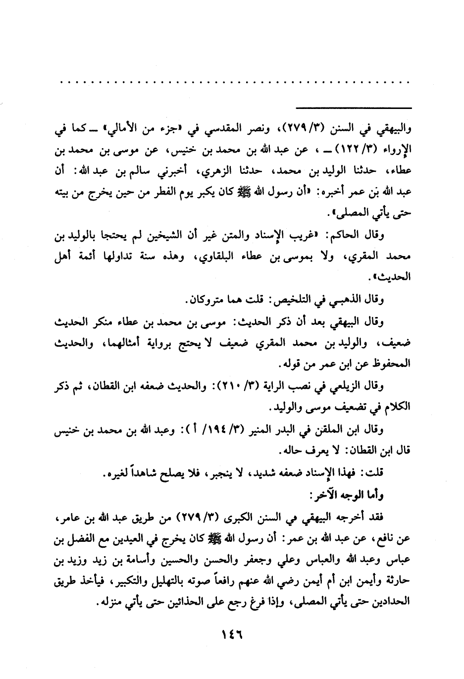 = والبيهقي في السنن (3/ 279)، ونصر المقدسي في "جزء من الأمالي" -كما في الأرواء (3/ 122) -، عن عبد الله بن محمد بن خنيس، عن موسى بن محمد بن عطاء، حدثنا الوليد بن محمد، حدثنا الزهري، أخبرني سالم بن عبد الله: أن عبد الله بن عمر أَخْبَرَهُ: "أَنَّ رَسُولَ اللَّهِ -صَلَّى اللَّهُ عَلَيْهِ وسلم- كان يكبر يوم الفطر من حين يخرج من بيته حتى يأتي المصلى".