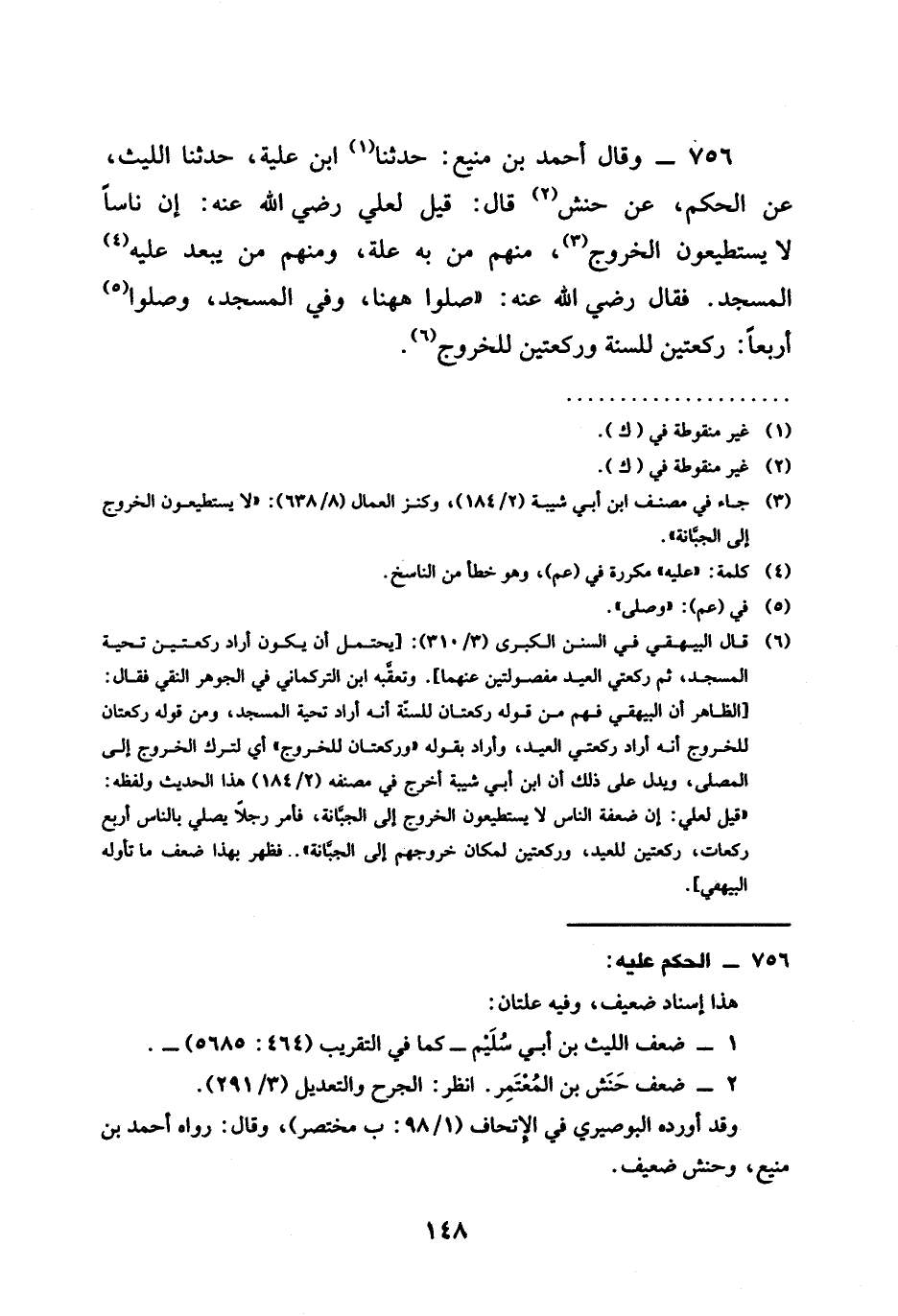 حَدَّثَنَا ابْنُ عُلَيَّةَ حَدَّثَنَا اللَّيْثُ عَنِ الْحَكَمِ عَنْ حَنَشٍ قَالَ قِيلَ لِعَلِيٍّ رَضِيَ الله عَنْهُ إِنَّ نَاسًا لَا يَسْتَطِيعُونَ الْخُرُوجَ مِنْهُمْ مَنْ بِهِ عِلَّةٌ وَمِنْهُمْ مَنْ يَبْعُدُ عَلَيْهِ الْمَسْجِدُ فَقَالَ رَضِيَ اللَّهُ عنه §صلوا ها هنا وَفِي الْمَسْجِدِ وَصَلُّوا أَرْبَعًا رَكْعَتَيْنِ لِلسُّنَّةِ وَرَكْعَتَيْنِ لِلْخُرُوجِ