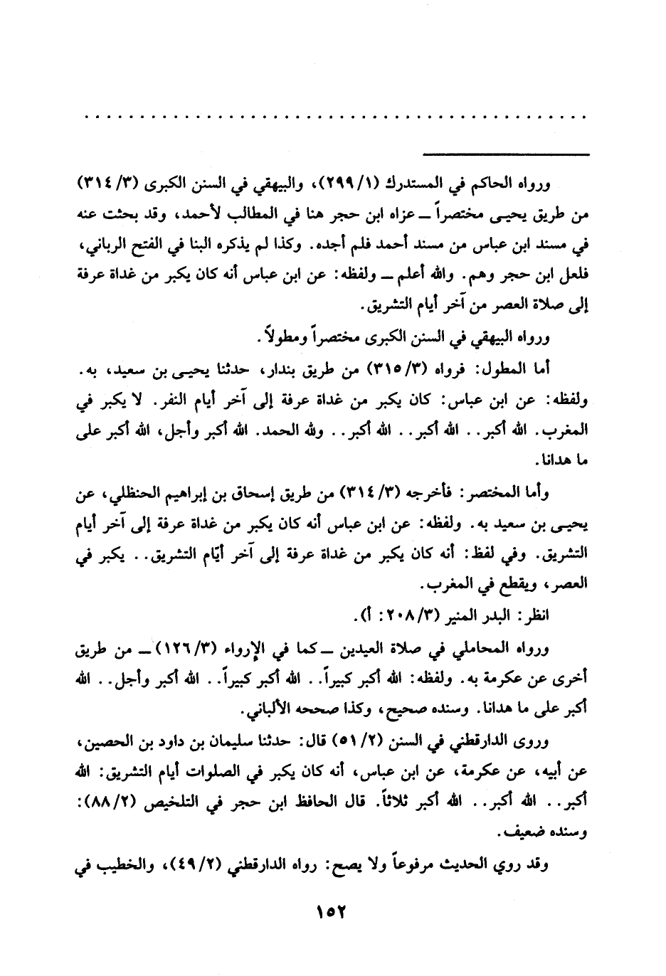 وأما المختصر: فأخرجه (3/ 314) من طريق إسحاق بن إبراهيم الحنظلي، عن يحيى بن سعيد به. ولفظه: عن ابن عباس أَنَّهُ كَانَ يُكَبِّرُ مِنْ غَدَاةِ عَرَفَةَ إِلَى آخر أيام التشريق. وفي لفظ: أَنَّهُ كَانَ يُكَبِّرُ مِنْ غَدَاةِ عَرَفَةَ إِلَى آخر أيّام التشريق .. يكبر في العصر، ويقطع في المغرب.