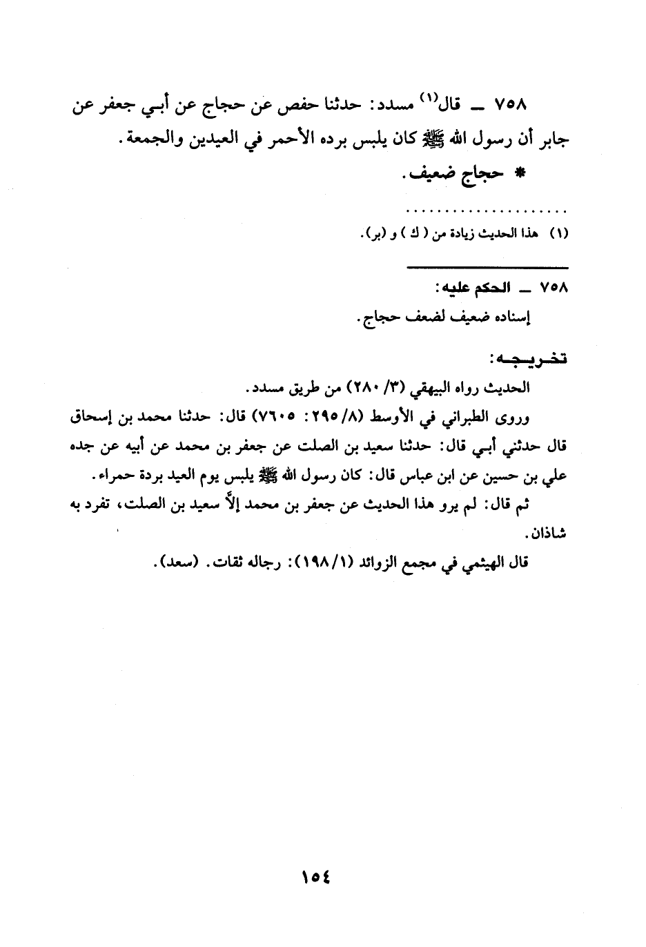 حَدَّثَنَا حَفْصٌ عَنْ حَجَّاجٍ عَنْ أَبِي جَعْفَرٍ عَنْ جَابِرٍ أَنَّ رَسُولَ اللَّهِ صَلَّى اللَّهُ عَلَيْهِ وَسَلَّمَ كَانَ §يَلْبَسُ بُرْدَهُ الْأَحْمَرَ فِي الْعِيدَيْنِ وَالْجُمُعَةِ