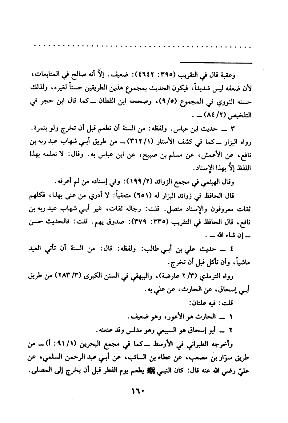 4 - حديث علي بن أبي طالب: ولفظه: قال: من السنة أن تأتي العيد ماشيًا، وأن تأكل قبل أن تخرج.