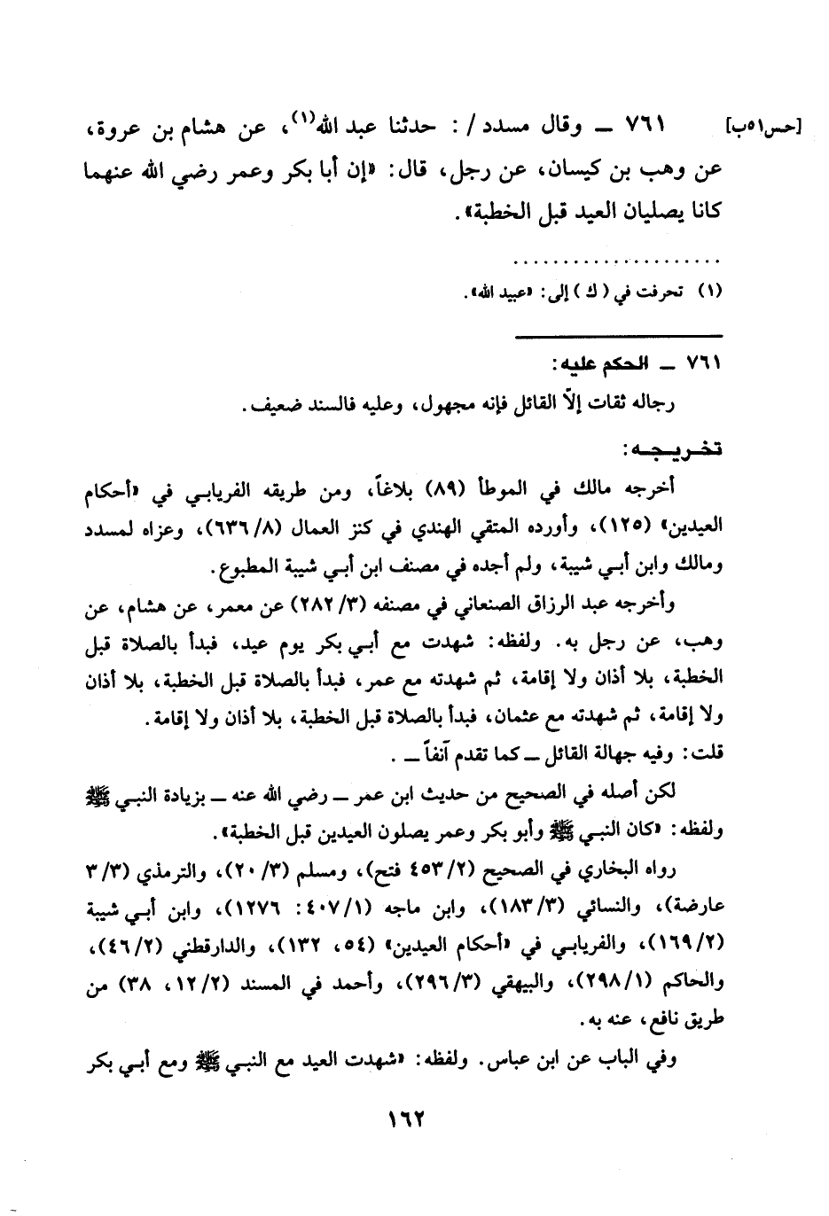 حَدَّثَنَا عَبْدُ اللَّهِ عَنْ هِشَامِ بْنِ عُرْوَةَ عَنْ وَهْبِ بْنِ كَيْسَانَ عَنْ رَجُلٍ قَالَ إِنَّ §أَبَا بَكْرٍ وَعُمَرَ رَضِيَ الله عَنْهُمَا كَانَا يُصَلِّيَانِ الْعِيدَ قَبْلَ الْخُطْبَةِ
