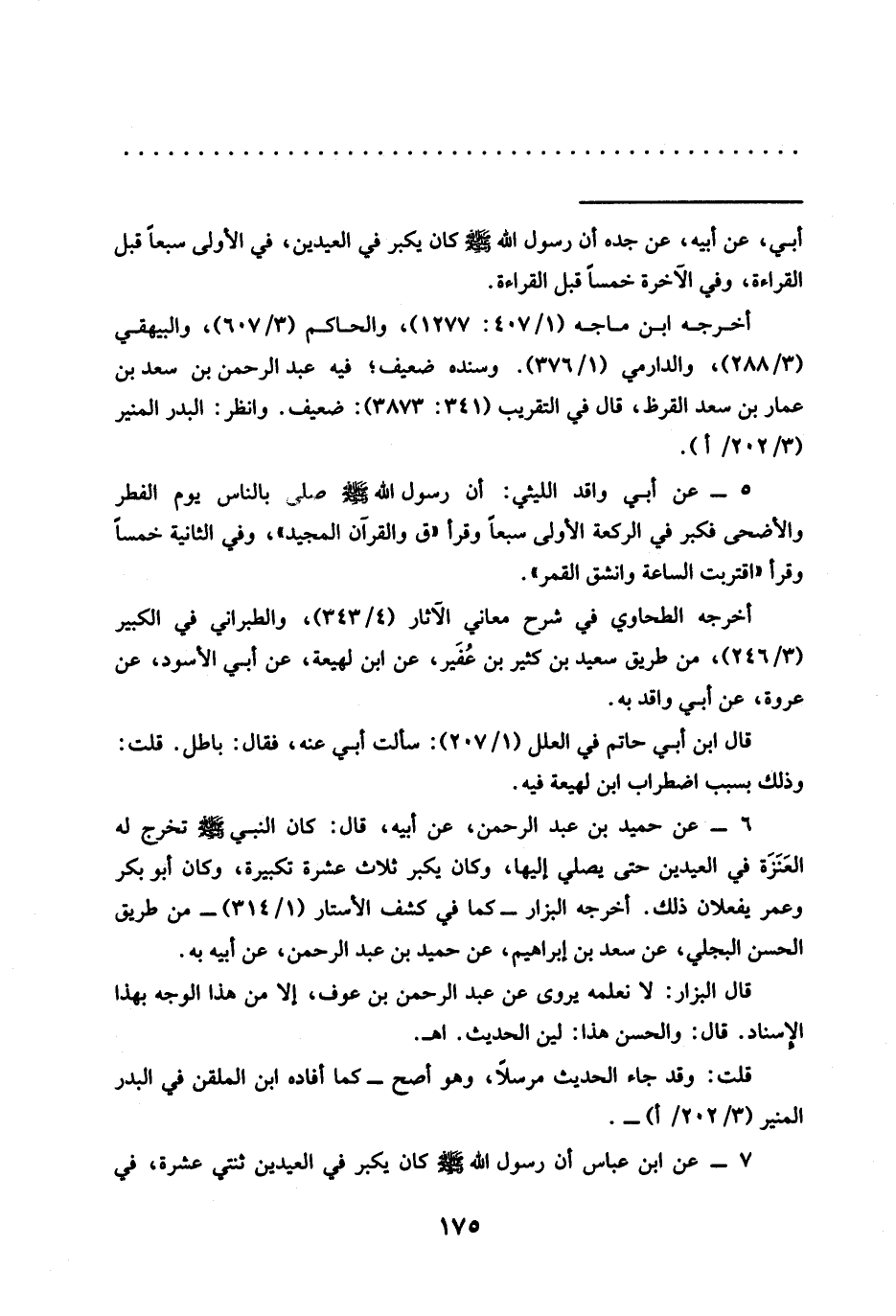 5 - عن أبي واقد الليثي: أن رسول الله -صلى الله عليه وسلم- صلى بالناس يوم الفطر والأضحى فكبر في الركعة الأولى سبعًا وقرأ (ق والقرآن المجيد،، وفي الثانية خمسًا وقرأ "اقتربت الساعة وانشق القمر".