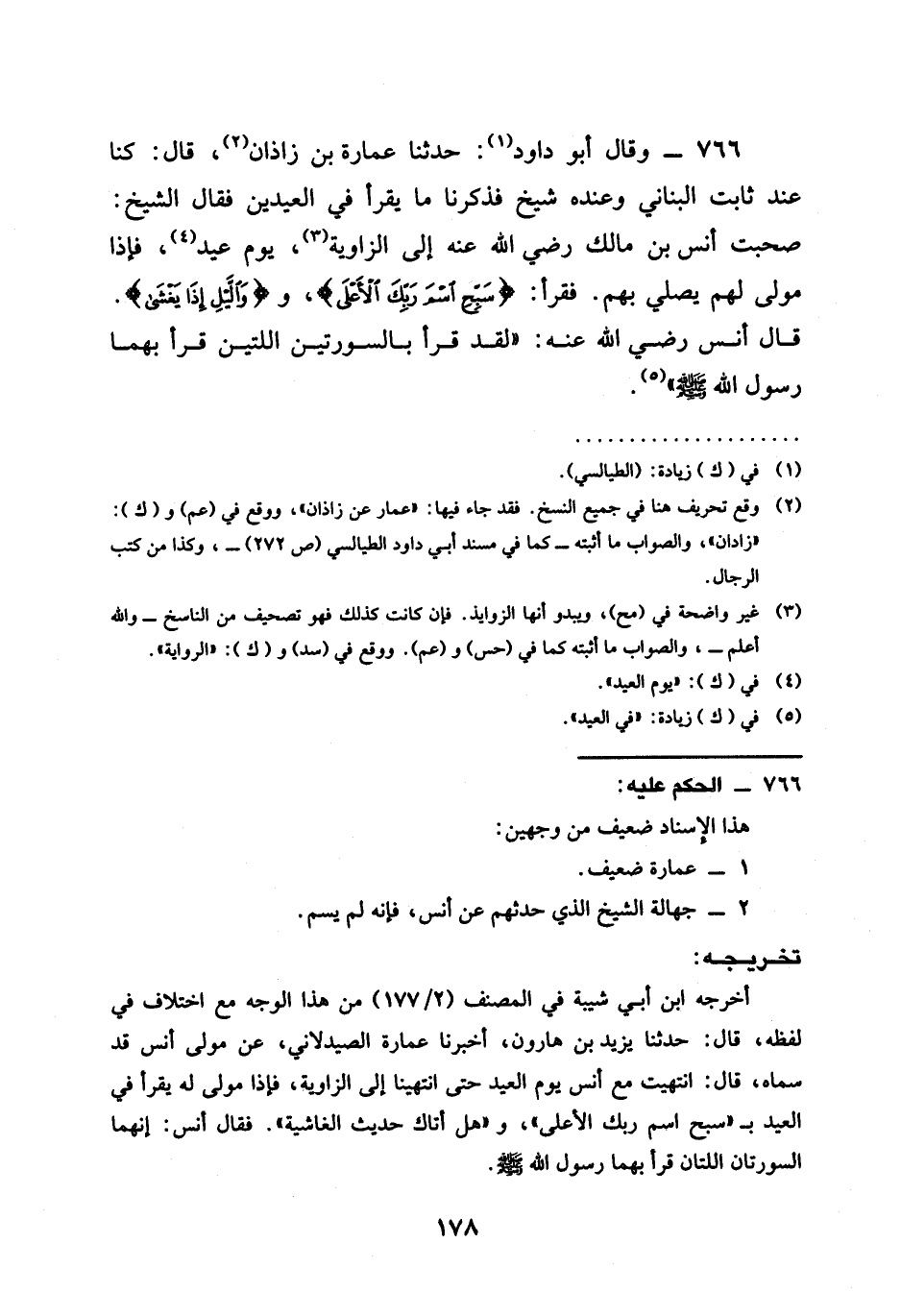 حَدَّثَنَا عُمَارَةُ بْنُ زَاذَانَ قَالَ كُنَّا عِنْدَ ثَابِتٍ الْبُنَانِيِّ وَعِنْدَهُ شَيْخٌ فَذَكَرْنَا مَا يُقْرَأُ فِي الْعِيدَيْنِ فَقَالَ الشَّيْخُ صَحِبْتُ أَنَسَ بْنَ مَالِكٍ رَضِيَ الله عَنْهُ إِلَى الزَّاوِيَةِ يَوْمَ عِيدٍ فَإِذَا مَوْلًى لَهُمْ يُصَلِّي بِهِمْ فَقَرَأَ {سَبَّحِ اسْمَ رَبِّكَ الْأَعْلَى} وَ {والليل إذا يفشى} قَالَ أَنَسٌ رَضِيَ الله عَنْهُ لَقَدْ §قَرَأَ بِالسُّورَتَيْنِ اللَّتَيْنِ قَرَأَ بِهِمَا رَسُولُ اللَّهِ صَلَّى اللَّهُ عَلَيْهِ وَسَلَّمَ
