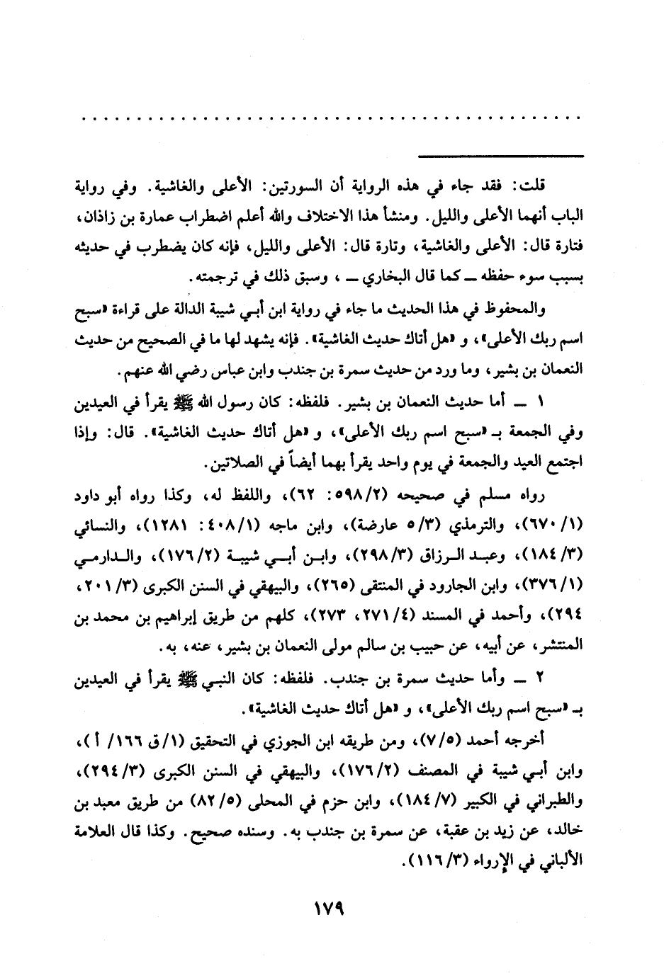 والمحفوظ في هذا الحديث ما جاء في رواية ابن أبي شيبة الدالة على قراءة "سبح اسم ربك الأعلى"، و"هل أتاك حديث الغاشية". فإِنه يشهد لها ما في الصحيح من حديث النعمان بن بشير، وما ورد من حديث سمرة بن جندب وابن عباس رضي الله عنهم.