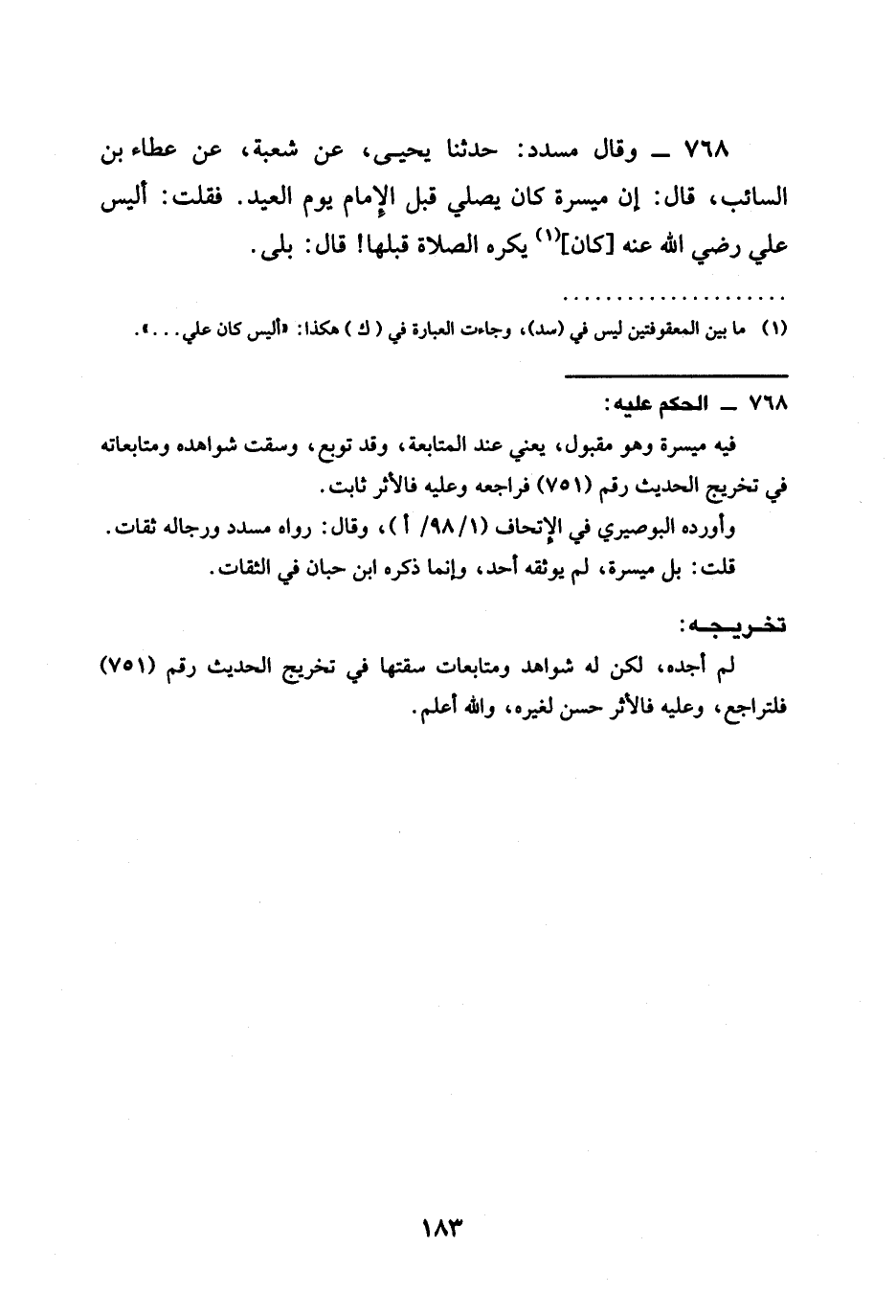 حَدَّثَنَا يَحْيَى عَنْ شُعْبَةَ عَنْ عَطَاءِ بْنِ السَّائِبِ قَالَ إِنَّ مَيْسَرَةَ كَانَ يُصَلِّي قَبْلَ الْإِمَامِ يَوْمَ الْعِيدِ فَقُلْتُ §أَلَيْسَ عَلِيٌّ رَضِيَ الله عَنْهُ كَانَ يَكْرَهُ الصَّلَاةَ قَبْلَهَا قَالَ بَلَى