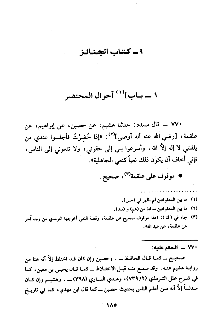 حَدَّثَنَا هُشَيْمٌ عَنْ حُصَيْنٍ عَنْ إِبْرَاهِيمَ عَنْ عَلْقَمَةَ رَضِيَ الله عَنْهُ أَنَّهُ أَوْصَى §إِذَا حُضِرْتُ فَأَجْلِسُوا عِنْدِي مَنْ يُلَقِّنُنِي لَا إِلَهَ إِلَّا اللَّهُ وَأَسْرِعُوا بِي إِلَى حُفْرَتِي وَلَا تَنْعُونِي إِلَى النَّاسِ فَإِنِّي أَخَافُ أَنْ يَكُونَ ذَلِكَ نَعْيًا كَنَعْيِ الْجَاهِلِيَّةِ
