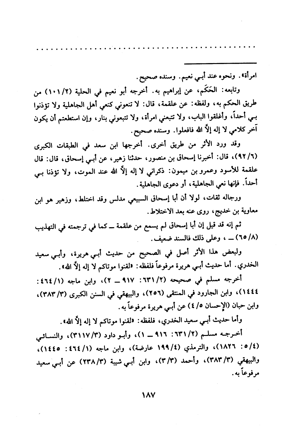وقد ورد الأثر من طريق أخرى. أخرجها ابن سعد في الطبقات الكبرى (6/ 92)، قال: أخبرنا إسحاق بن منصور، حدثنا زهير، عن أبي إسحاق، قال: قال علقمة للأسود وعمرو بن ميمرن: ذكراني لا إله إلَّا الله عند الموت، ولا تؤذنا بي أحدًا. فإنها نعي الجاهلية، أو دعوى الجاهلية.