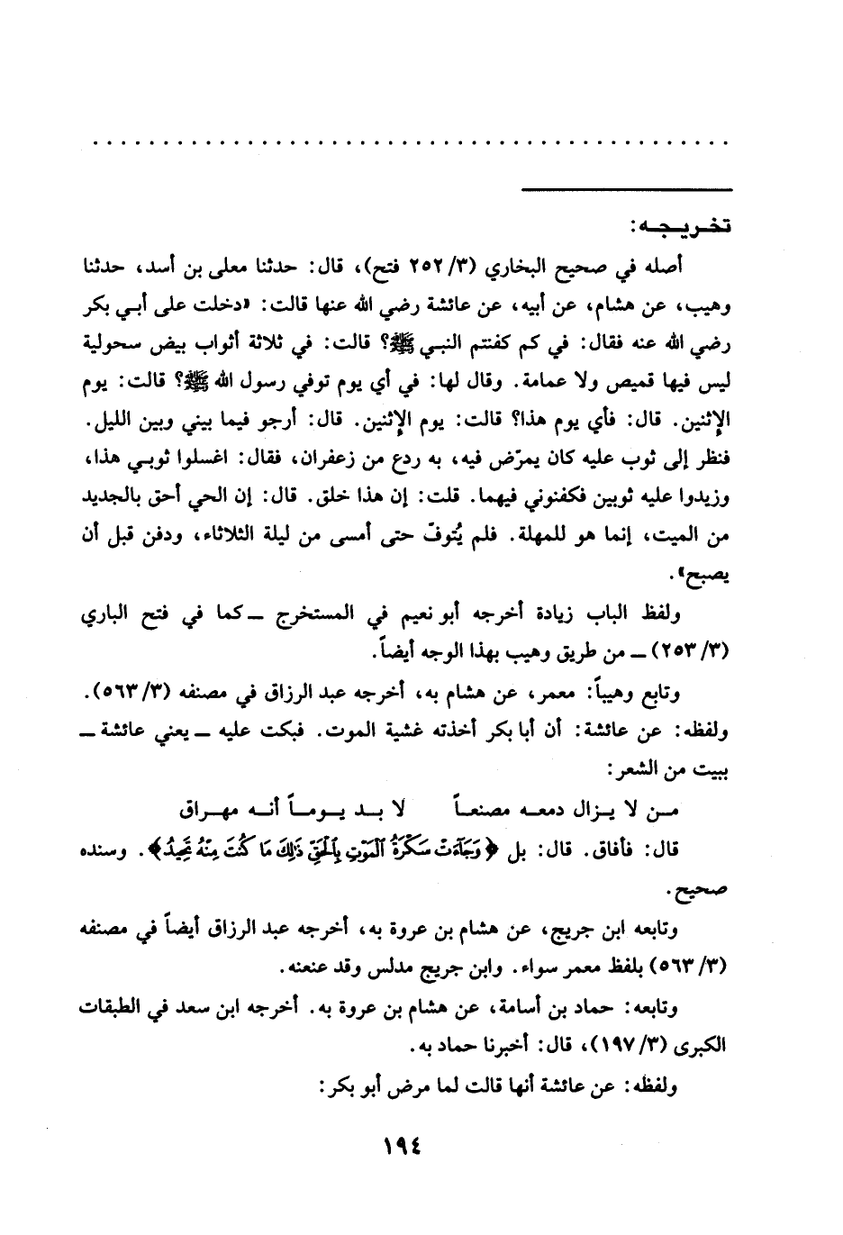 فنظر إلى ثوب عليه كان يمرّض فيه، به ردع من زعفران، فقال: اغسلوا ثوبي هذا، وزيدوا عليه ثوبين فكفنوني فيهما. قلت: إن هذا خلق. قال: إن الحي أحق بالجديد من الميت، إنما هو للمهلة. فلم يُتوفّ حتى أمسى من ليلة الثلاثاء، ودفن قبل أن يصبح".