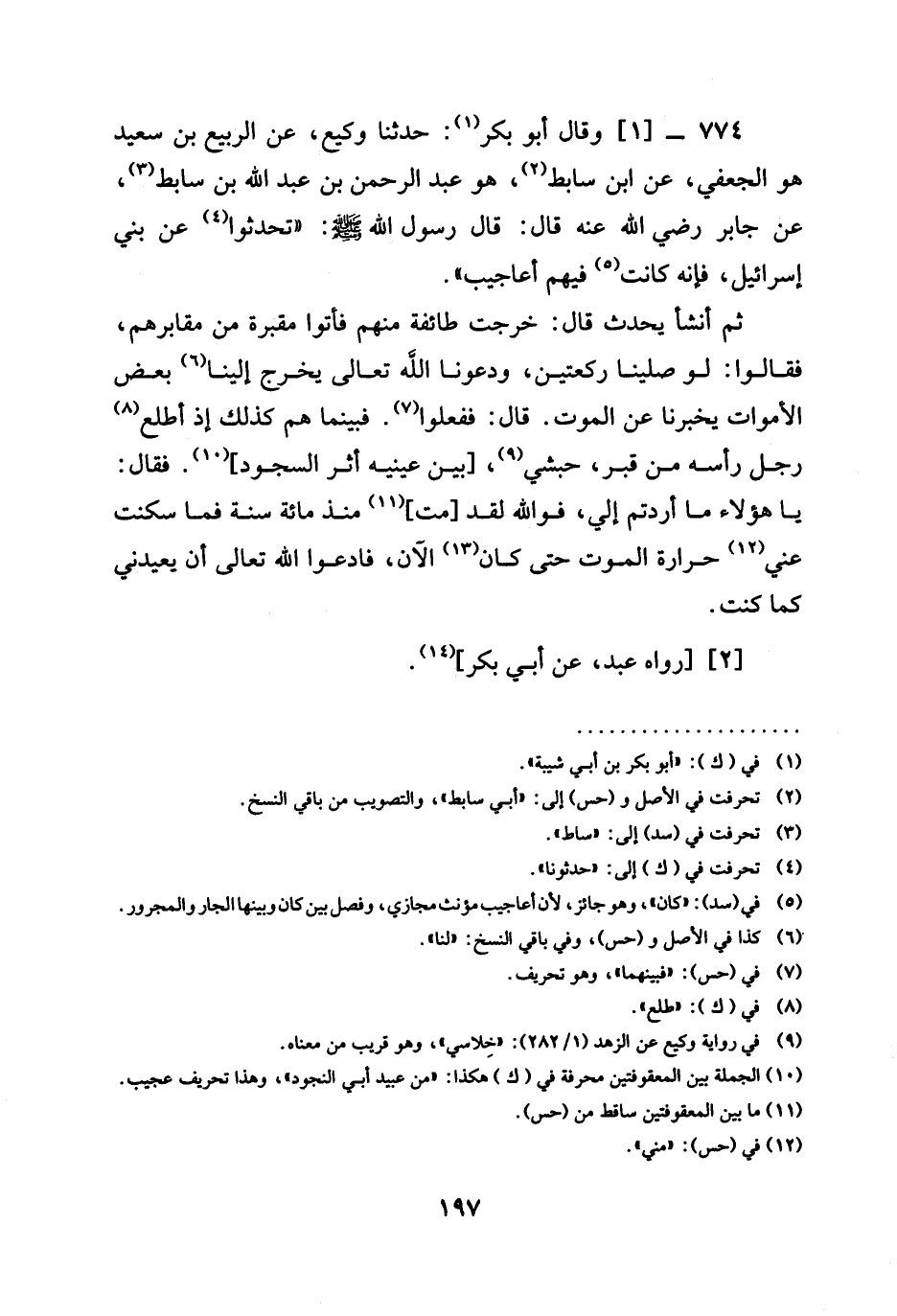 حَدَّثَنَا وَكِيعٌ عَنِ الرَّبِيعِ بْنِ سَعِيدٍ هُوَ الْجُعْفِيُّ عَنِ ابْنِ سَابِطٍ هُوَ عَبْدُ الرَّحْمَنِ بْنُ عَبْدِ اللَّهِ بْنِ سَابِطٍ عَنْ جَابِرٍ رَضِيَ الله عَنْهُ قَالَ قَالَ رَسُولُ اللَّهِ صَلَّى اللَّهُ عَلَيْهِ وَسَلَّمَ §تَحَدَّثُوا عَنْ بَنِي إِسْرَائِيلَ فَإِنَّهُ كَانَتْ فِيهِمْ أَعَاجِيبُ ثُمَّ أَنْشَأَ يُحَدِّثُ قَالَ خَرَجَتْ طَائِفَةٌ مِنْهُمْ فَأَتَوْا مَقْبَرَةً مِنْ مَقَابِرِهِمْ فَقَالُوا لَوْ صَلَّيْنَا رَكْعَتَيْنِ وَدَعَوْنَا اللَّهَ تَعَالَى يُخْرِجُ إِلَيْنَا بَعْضَ الْأَمْوَاتِ يُخْبِرُنَا عَنِ الْمَوْتِ قَالَ فَفَعَلُوا فَبَيْنَمَا هُمْ كَذَلِكَ إِذَ أَطْلَعَ رَجُلٌ رَأْسَهُ مِنْ قَبْرِ حَبَشِيٍّ بَيْنَ عَيْنَيْهِ أَثَرُ السُّجُودِ فَقَالَ يَا هَؤُلَاءِ مَا أَرَدْتُمْ إِلَيَّ فَوَاللَّهِ لَقَدْ مُتُّ مُنْذُ مِائَةِ سَنَةٍ فَمَا سَكَنَتْ عَنِّي حَرَارَةُ الْمَوْتِ حَتَّى كَانَ الْآنَ فادعوا الله تعالى أَنْ يُعِيدَنِي كَمَا كُنْتُ رَوَاهُ عَبْدٌ عَنْ أَبِي بَكْرٍ