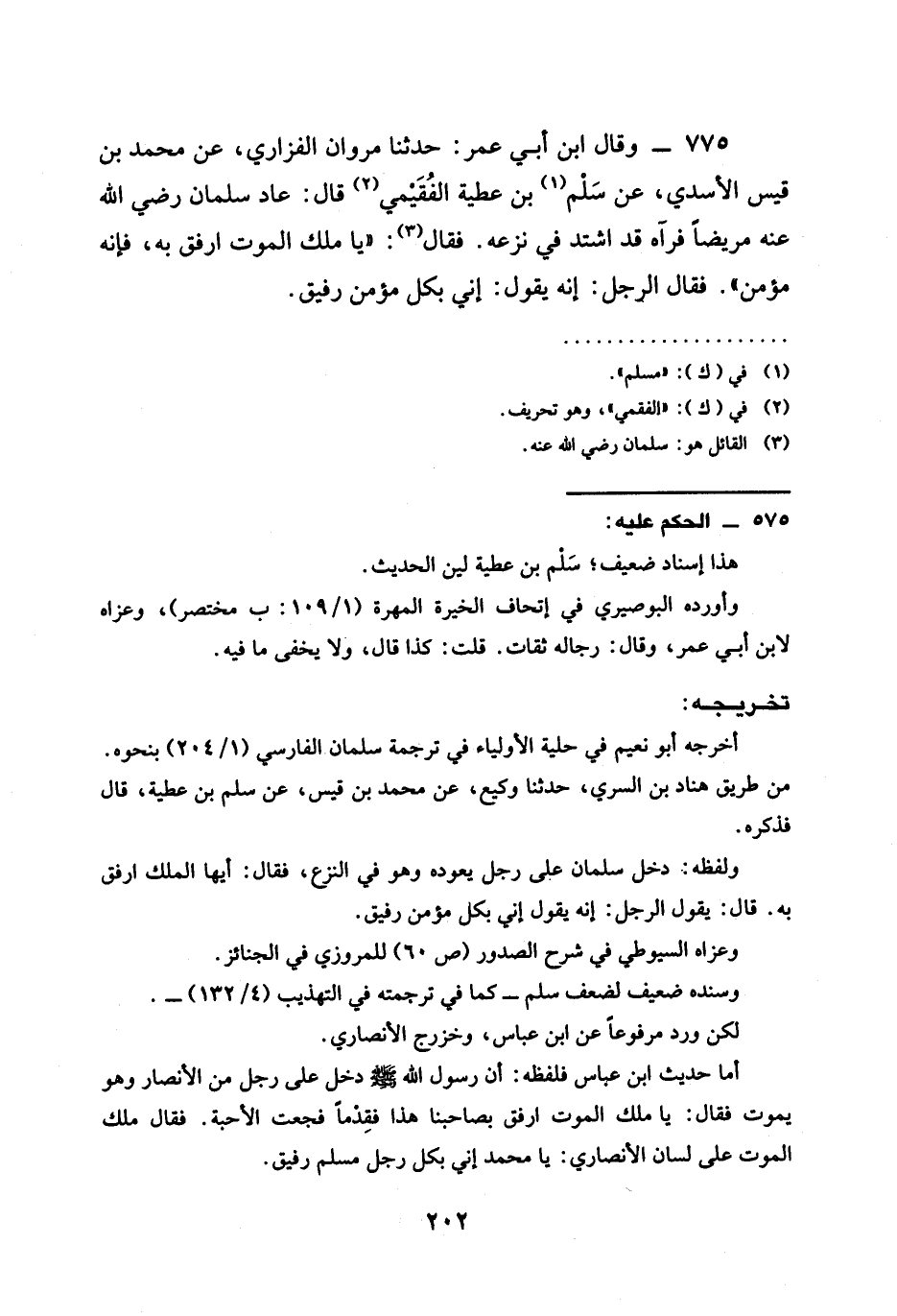 حَدَّثَنَا مَرْوَانُ الْفَزَارِيُّ عَنْ مُحَمَّدِ بْنِ قَيْسٍ الْأَسَدِيِّ عَنْ سَلْمِ بْنِ عَطِيَّةَ الْفُقَيْمِيِّ قَالَ عَادَ سَلْمَانُ رَضِيَ الله عَنْهُ مَرِيضًا فَرَآهُ قَدِ اشْتَدَّ فِي نَزْعِهِ فَقَالَ §يَا مَلَكَ الْمَوْتِ ارْفُقْ بِهِ فَإِنَّهُ مُؤْمِنٌ فَقَالَ الرَّجُلُ إِنَّهُ يَقُولُ إِنِّي بِكُلِّ مُؤْمِنٍ رَفِيقٌ