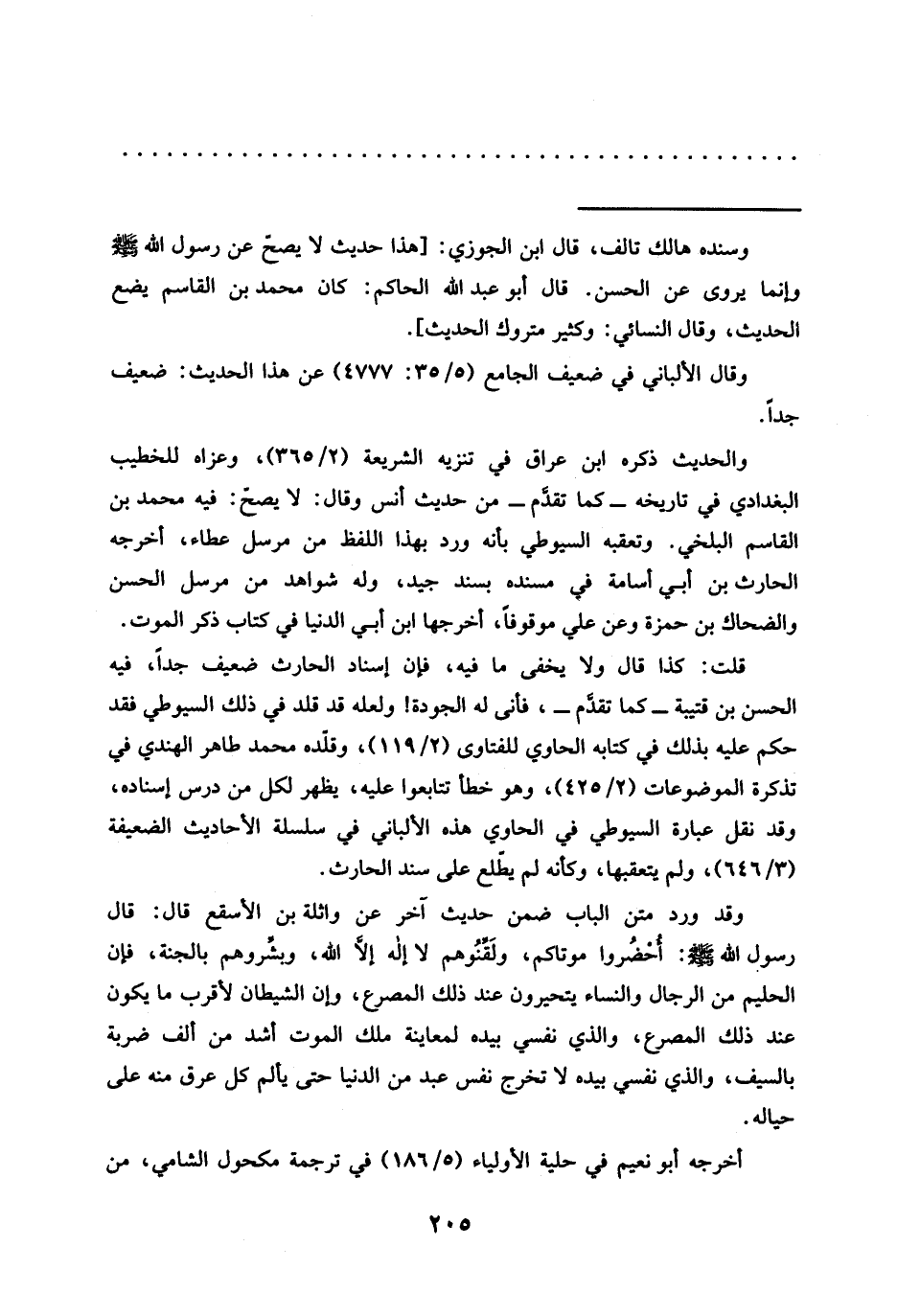 = وسنده هالك تالف، قال ابن الجوزي: [هذا حديث لا يصحّ عَنْ رَسُولِ اللَّهِ -صَلَّى اللَّهُ عَلَيْهِ وَسَلَّمَ - وإنما يروى عن الحسن. قال أبو عبد الله الحاكم: كان محمَّد بن القاسم يضع الحديث، وقال النسائي: وكثير متروك الحديث].
